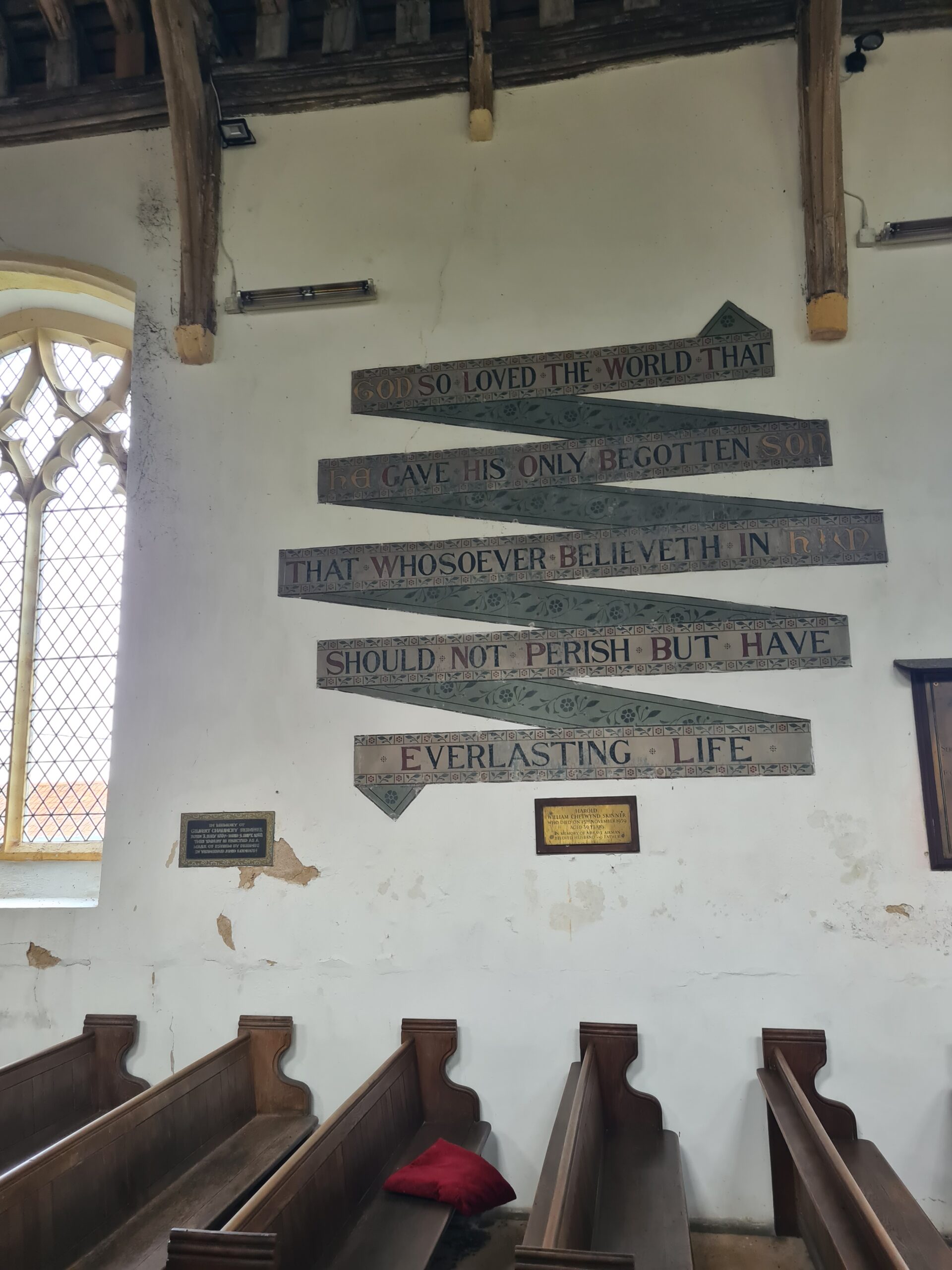 Mostly flint construction with early Saxon features in North Wall. Exceptionally tall C14 tower, with a fine set of six bells - one of the heaviest in the county. Chancel C13, the rest is C14. Splendid Nave roof. Jacobean Pulpit, Carolingian unique elevated " Buxton family pew" which was granted a faculty from Archbishop Laud.