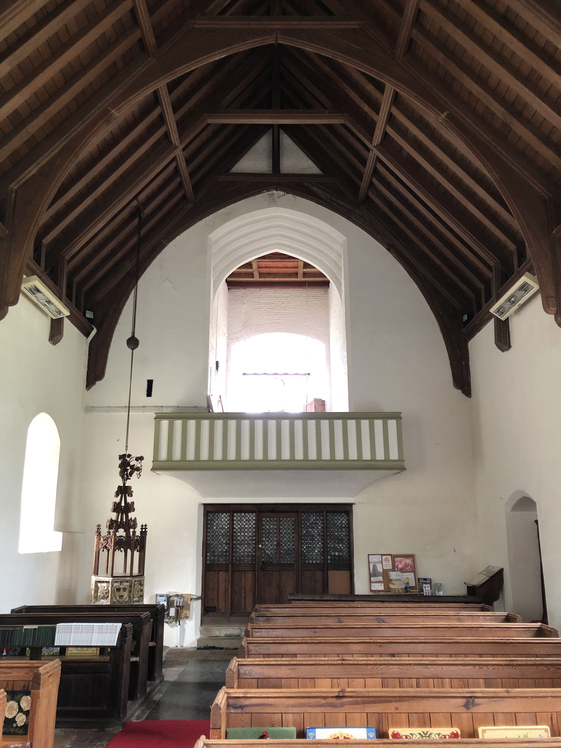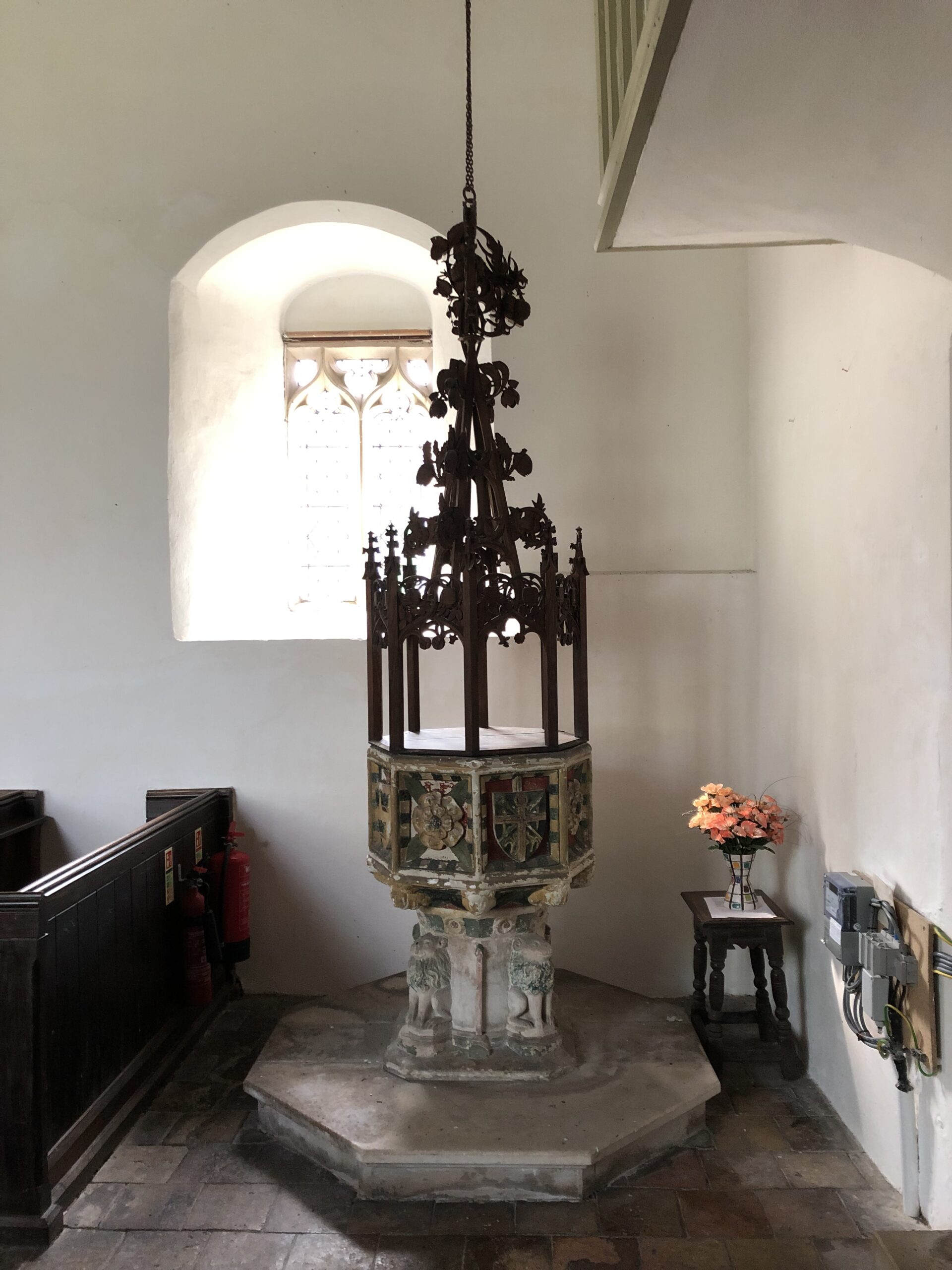 Open dawn to dusk.Not far from the eccentric ziggurat tower of Burgh St Peter, St Mary lies Wheatacre, St Mary with its fantastic chequerboard tower and mighty buttresses, with squares of flint and brick. This dates from the early 16th century. Fine multi-stepped brickwork can be found in the west doorway and the mullioned west window. The chancel arch contains within it the arched entrances to the chancel and a side chapel. The church was much altered in the 1880s. The nave and chancel exterior are Victorian, as is the parapet of the tower. Notice the carved heads of a king and a queen by the south nave doorway. The tower has one bell dated 1618. Inside, the east end of the church dates to the 14th century and it is likely that the nave was rebuilt at the same time as the tower. The colourful 15th century font with its unusual cover suspended from the ceiling and the Italian marble altar are well worth seeing. It is possible that the font cover dates to 1904 with the north chapel screen.
