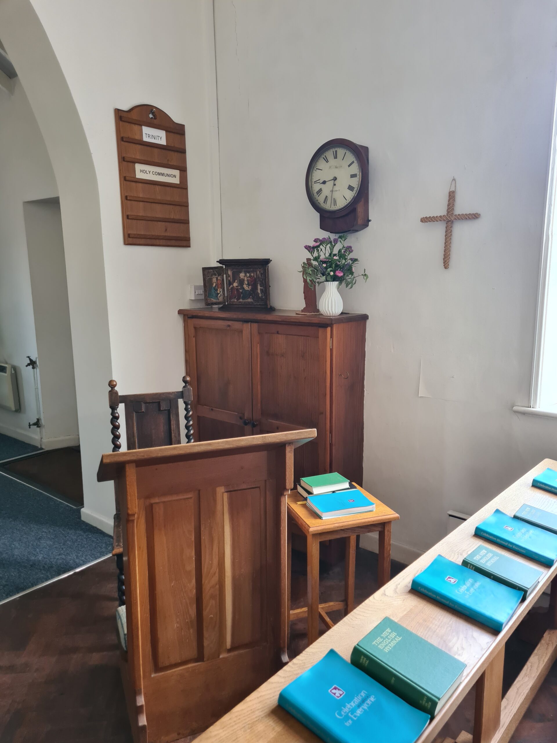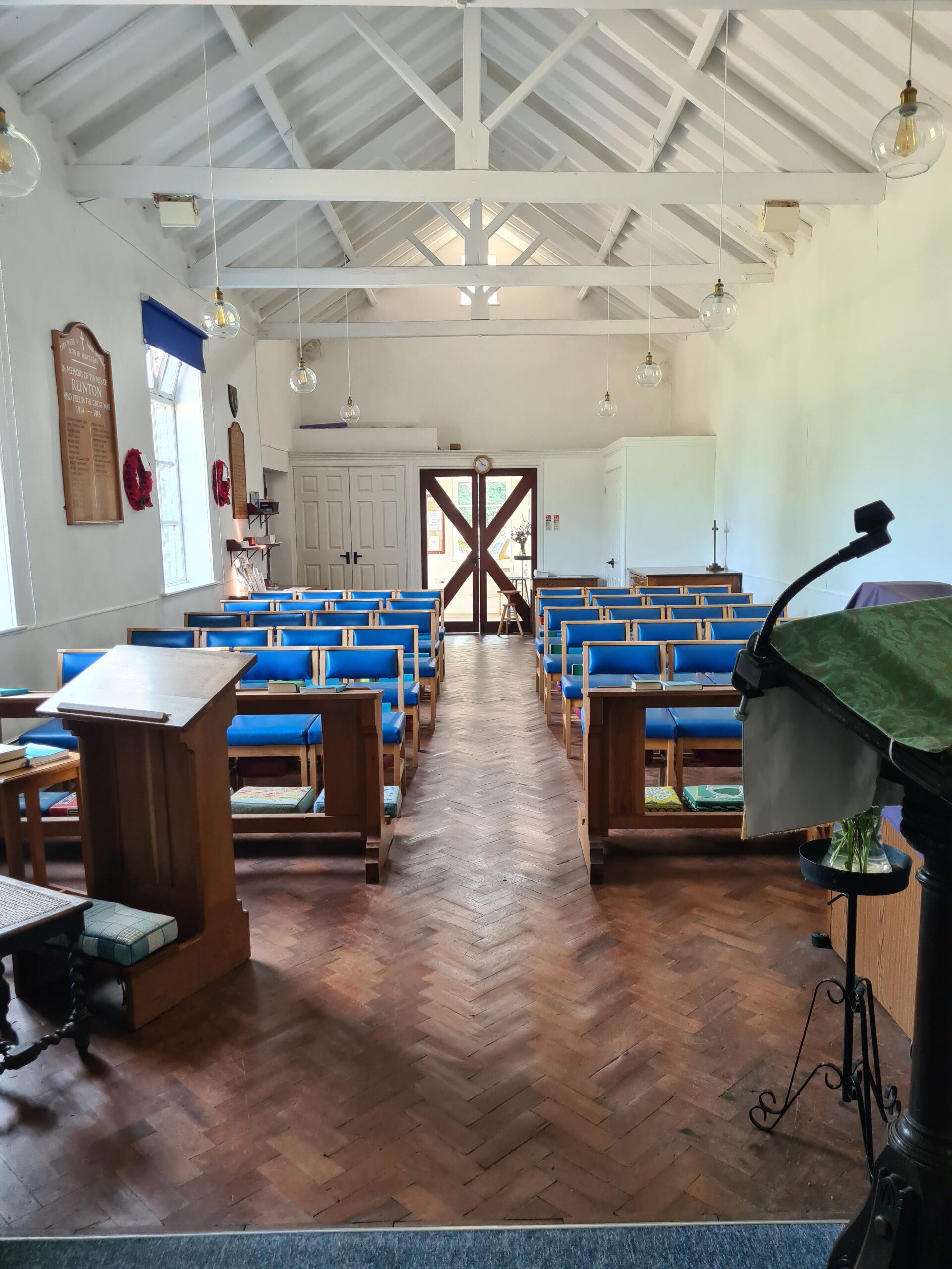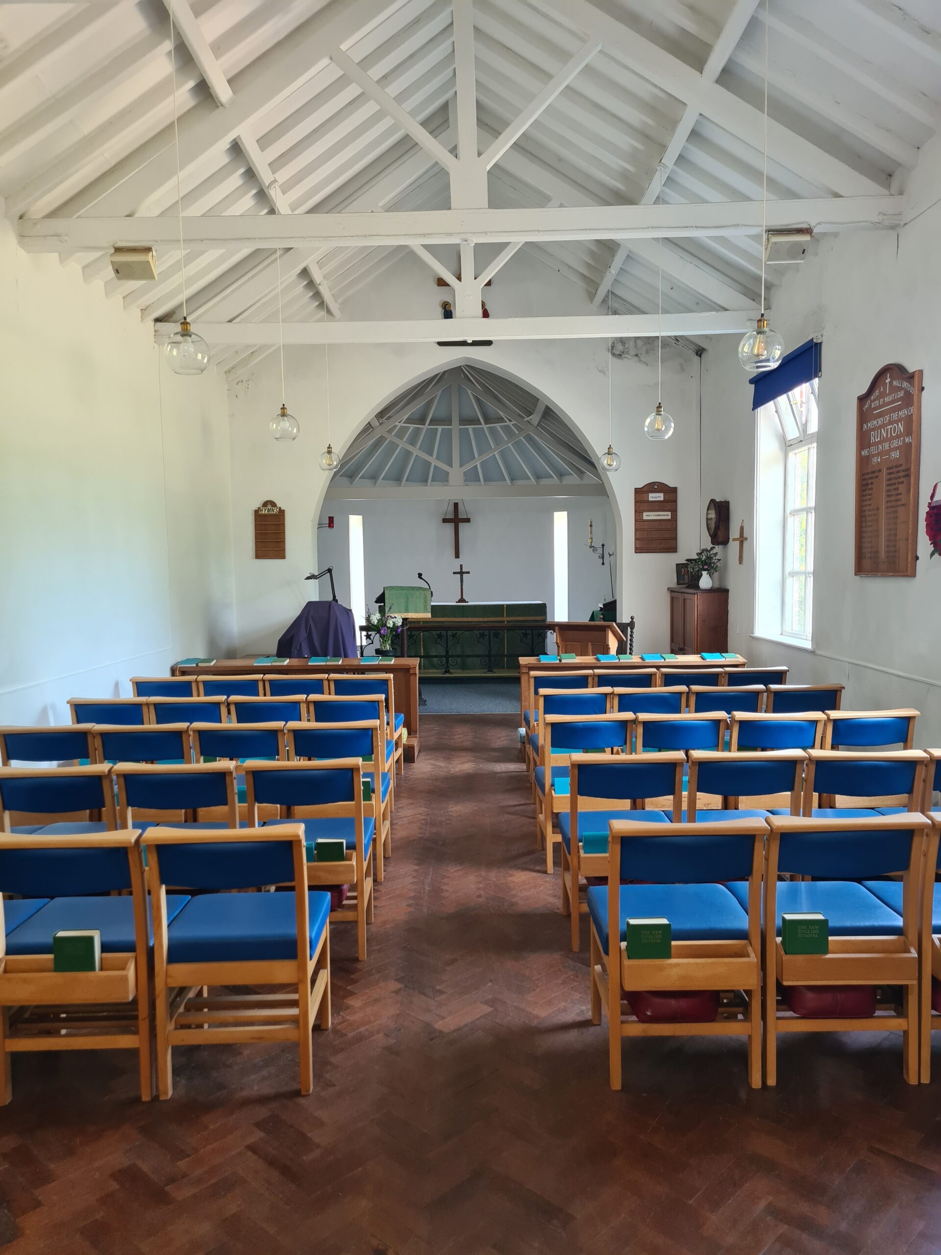 St Andrew’s Church in East Runton was originally a school. East Runton School belonged to the Buxton family and services were taken there from at least the 1890s by the rector of Beeston until 1918 when other premises had to be used. The school buildings were eventually sold to the PCC in 1959. The main part of the school was sold in 1977 for conversion to housing, leaving the current church building with the PCC. A large wooden cross to hang over the altar and a white Laudian altar cloth were gifted by a member of the congregation. Blue chairs were purchased from the parish church at Bournemouth, and the pews were sold for £30 each. A chest for storing vestments was gifted. It was time to turn the interior around, and on Advent Sunday the first Holy Communion at the north end was celebrated. The church at present consists of a single room, an extension to the east constructed of random ball flints with red bricks around the corners, windows and doors and an extension to the south comprising an entrance lobby and lavatory. There is a stone in the north gable end of the original building containing the date 1852.