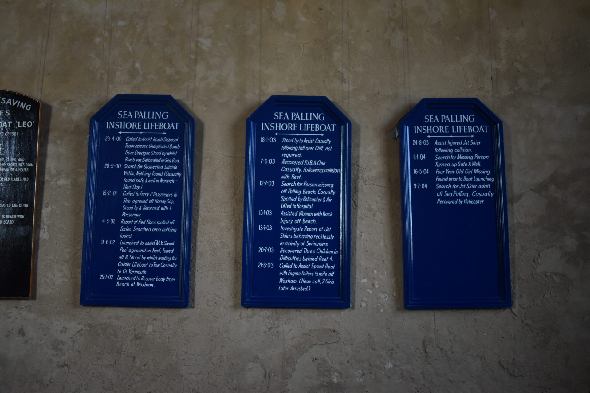 Lifeboat boards to RNLI and PVRS (Palling Volunteer Rescue Service). Commemoration plaque to those lost in the 1953 floods. Book of Remembrance to those lost in the two World Wars.
