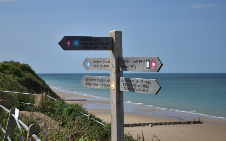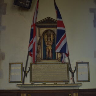The Church of St Michael and All Angels in Sidestrand originally had a Saxon tower with an octagonal top added in the 15th century. One night in 1841 it collapsed in a storm and a lower tower was built. MPs Samuel Hoare and Sir Thomas Fowell Buxton started fundraising to move the church to a safer position inland to protect it from coastal erosion. Much of the original masonry was reused and the new church was consecrated in 1881. The tower was left on the cliff edge and fell into the sea in 1916. The church inspired the poem by Clement Scott who wrote many articles about this area and made it famous as ‘Poppyland’ in the 19th century: ‘On the grass of the cliff, at the edge of the steep, God planted a garden – a garden of sleep.’ The headstones from the old churchyard are arranged along the present road-side wall. Note on the north aisle the communal grave for bones exposed in the old churchyard when the cliff fell. Inside, above the south door is a hatchment for Lord Templewood (d. 1959) and his wife (who d. 1962). The font is a plain octagon of the 15th century. The font cover was given in memory of Richard Hood who died aged 12 in 1930 of meningitis. Behind it, fixed to the wall are two pre-14th century stone coffin covers, taken from the original site in the old churchyard. One was known locally as the Crusader’s Stone. The nave is oak-panelled with names of departed members of the congregation. The stone corbels at the base of the roof have been painted red and marked with a cross in honour of St Michael. The organ was obtained from a church in Norwich.