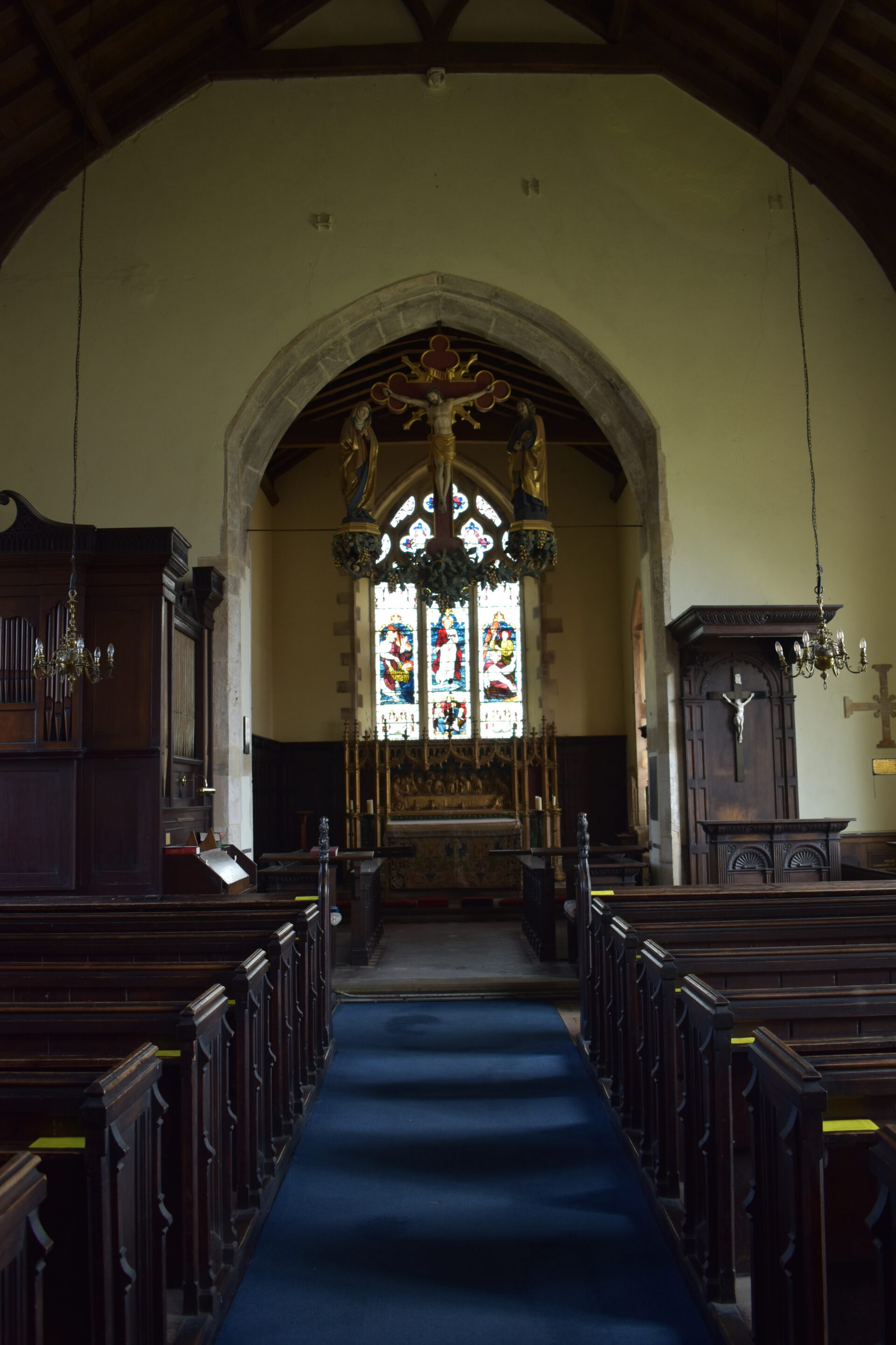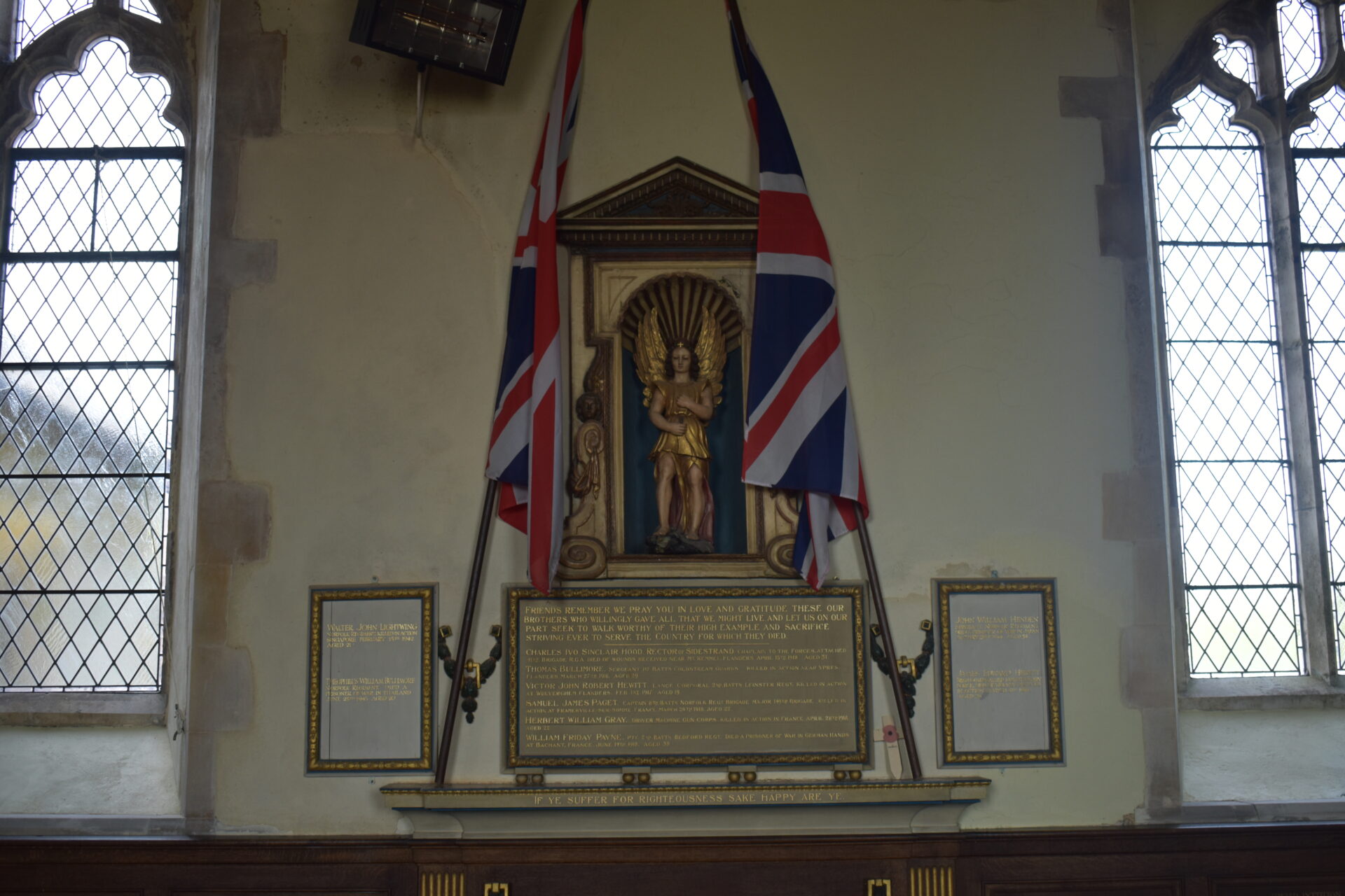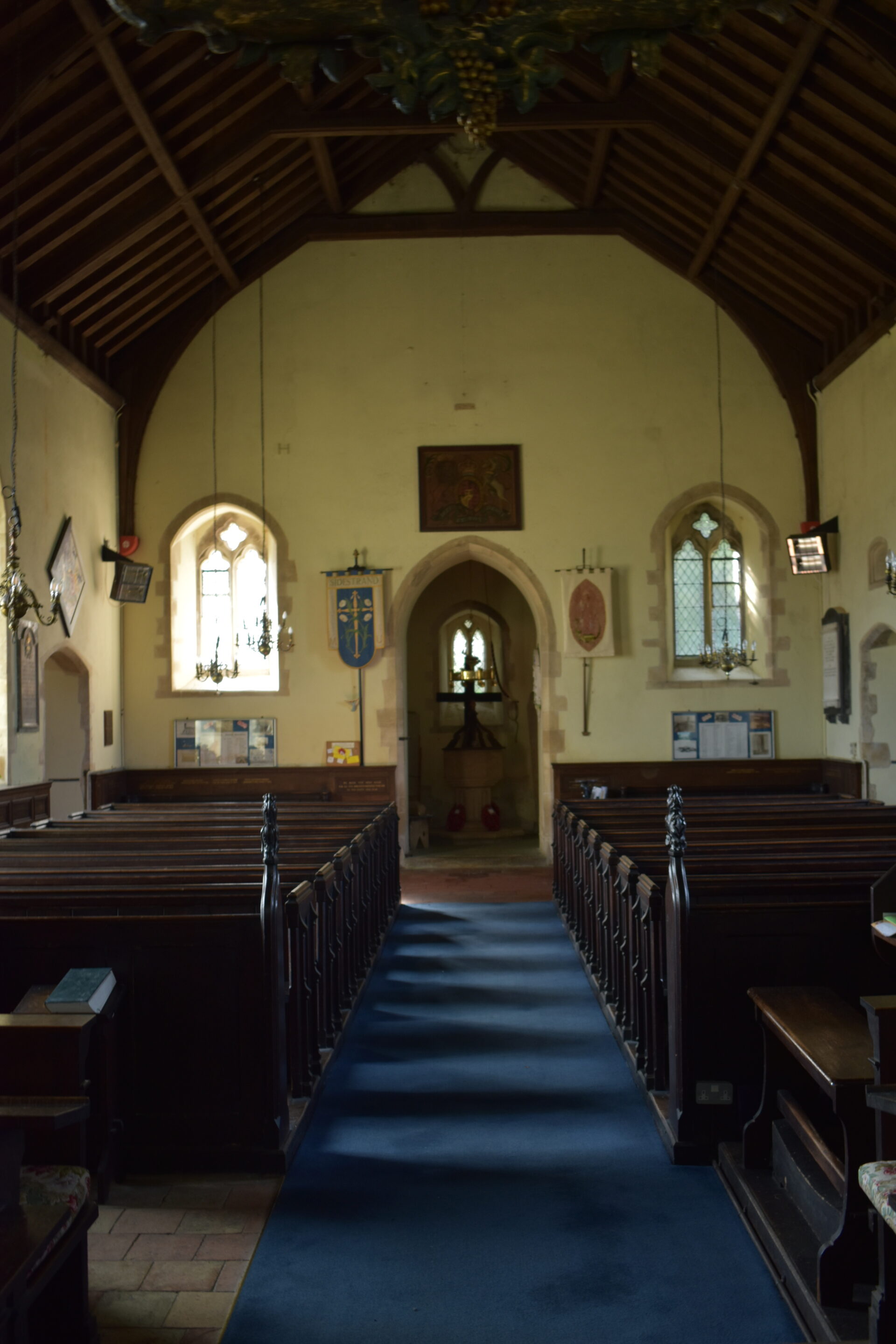 The Church of St Michael and All Angels in Sidestrand originally had a Saxon tower with an octagonal top added in the 15th century. One night in 1841 it collapsed in a storm and a lower tower was built. MPs Samuel Hoare and Sir Thomas Fowell Buxton started fundraising to move the church to a safer position inland to protect it from coastal erosion. Much of the original masonry was reused and the new church was consecrated in 1881. The tower was left on the cliff edge and fell into the sea in 1916. The church inspired the poem by Clement Scott who wrote many articles about this area and made it famous as ‘Poppyland’ in the 19th century: ‘On the grass of the cliff, at the edge of the steep, God planted a garden – a garden of sleep.’ The headstones from the old churchyard are arranged along the present road-side wall. Note on the north aisle the communal grave for bones exposed in the old churchyard when the cliff fell. Inside, above the south door is a hatchment for Lord Templewood (d. 1959) and his wife (who d. 1962). The font is a plain octagon of the 15th century. The font cover was given in memory of Richard Hood who died aged 12 in 1930 of meningitis. Behind it, fixed to the wall are two pre-14th century stone coffin covers, taken from the original site in the old churchyard. One was known locally as the Crusader’s Stone. The nave is oak-panelled with names of departed members of the congregation. The stone corbels at the base of the roof have been painted red and marked with a cross in honour of St Michael. The organ was obtained from a church in Norwich.