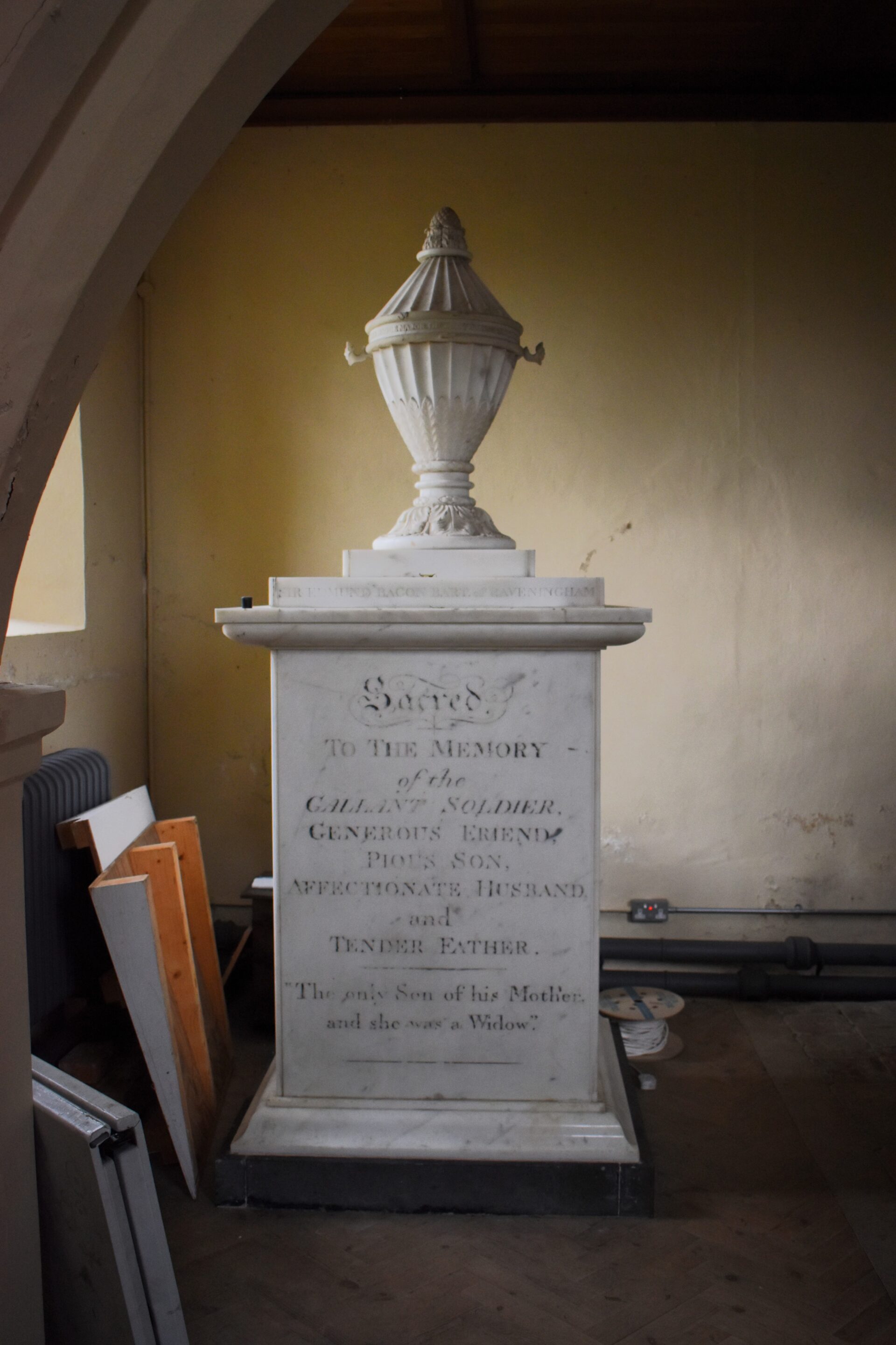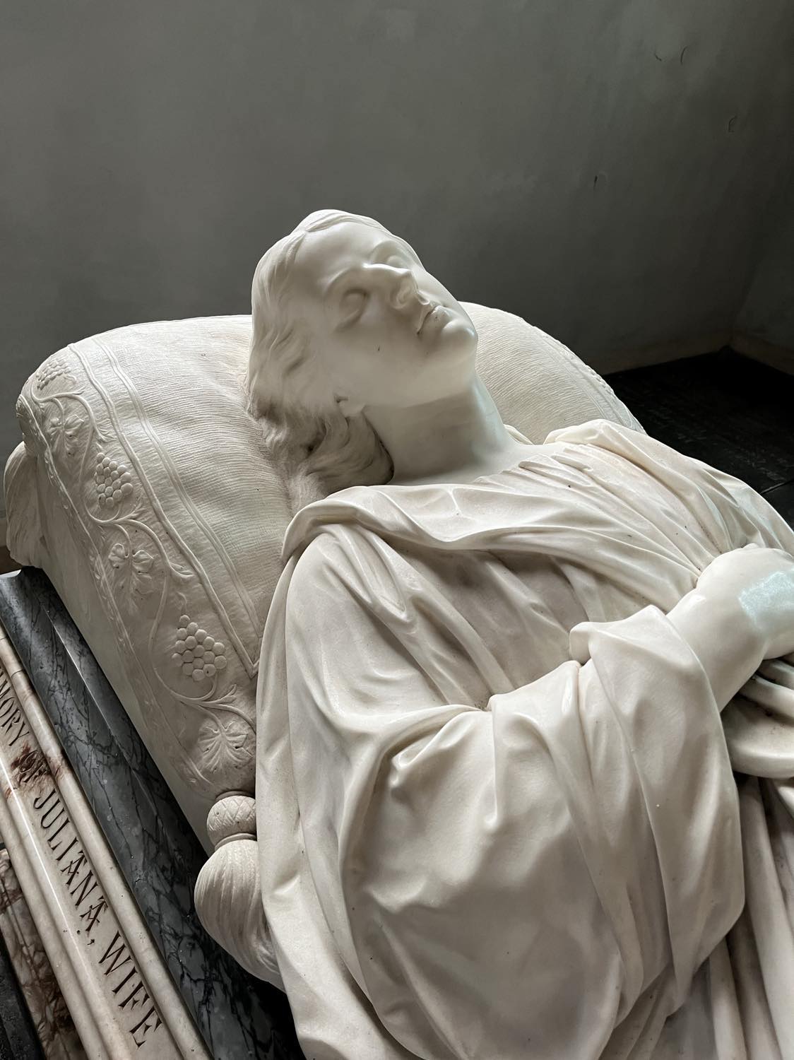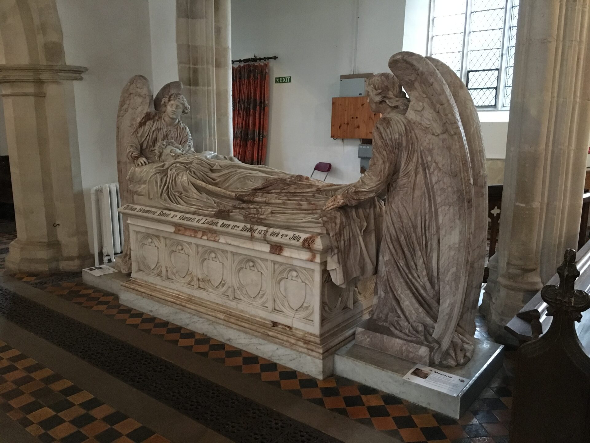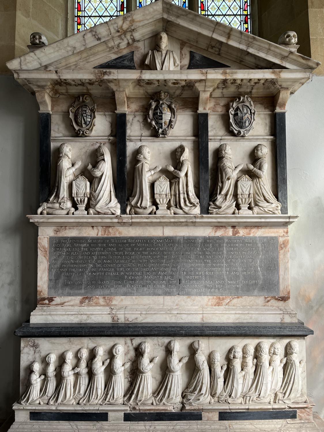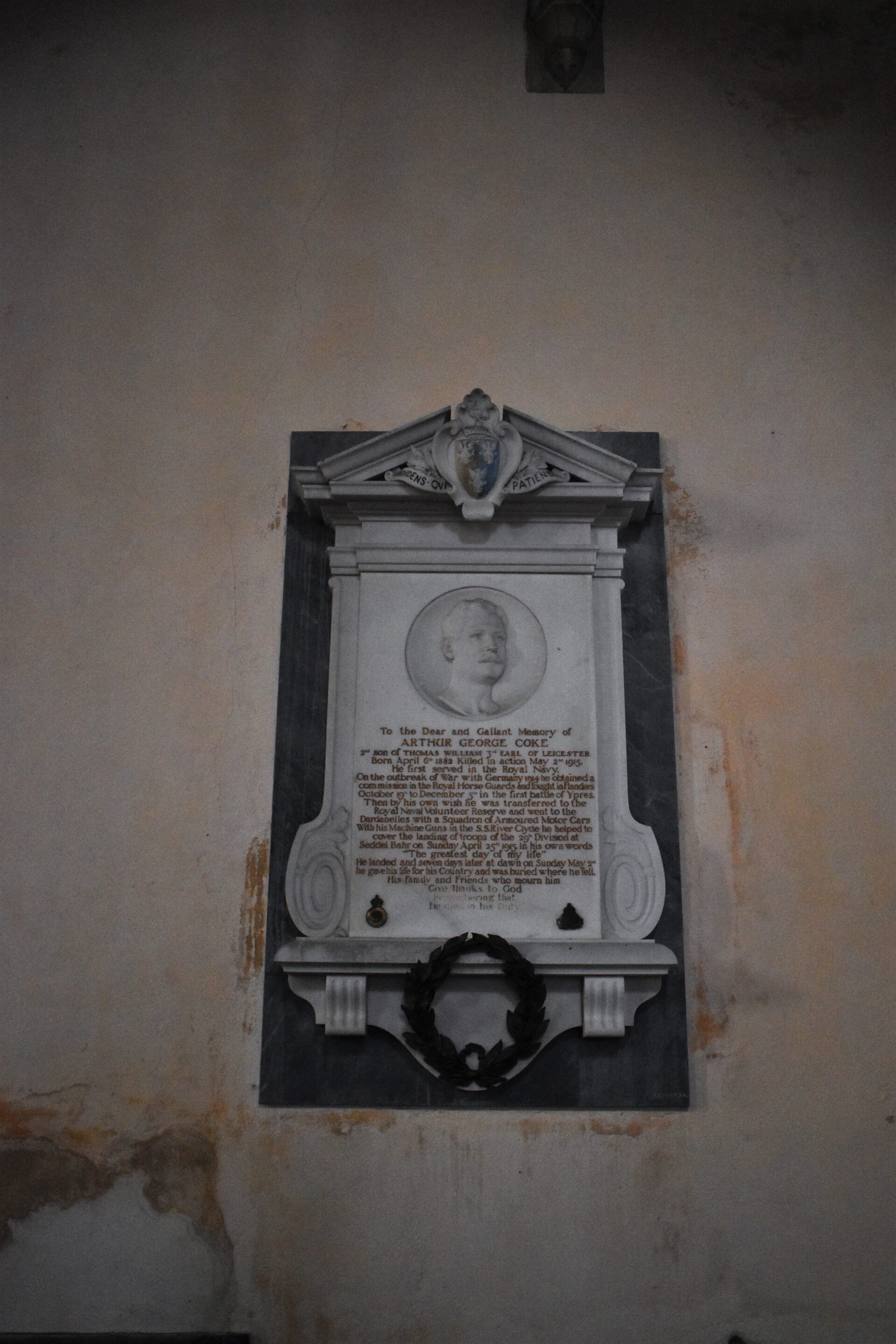 St Withburga’s Church proudly occupies a corner of the parkland of Holkham Hall. The sandy mound it sits on could be an Iron Age tumulus or simply a large dune and is surrounded in its entirety by the churchyard wall. Notice the mausoleum to the west. The imposing hall is about a mile away, beyond the lake and the herds of deer and sheep. There is another entrance to the church via the coast road. The dedication is highly unusual. The only other church of St Withburga was East Dereham (the site of her well) before it became St Nicholas. The medieval church was thoroughly restored and rebuilt in the 1860s. There is evidence of an earlier, Saxon church on this site. Inside there is an array of memorials, but for the vast Coke family memorials a visit to St Mary’s Church in Tittleshall is in order. At Holkham there is a memorial depicting three couples above their fifteen children. Some of the children are turned towards the viewer, smiling. The touching marble figure of Juliana Countess of Leicester lies peacefully in the north chapel. She paid £9,000 for the 1868 restoration (£563,481 in 2017 money). There are wall memorials in the north aisle commemorating the Coke sons killed in the World Wars.