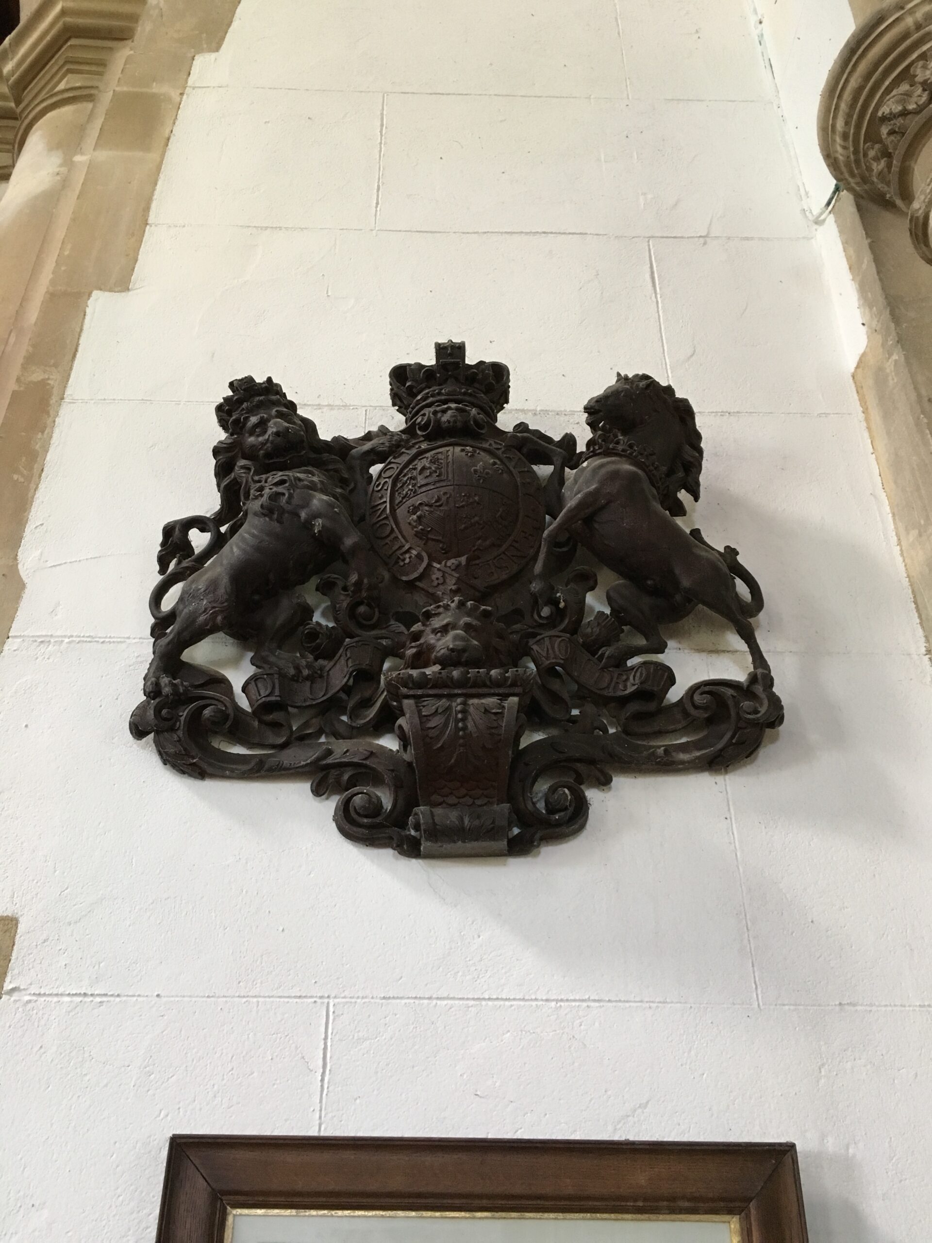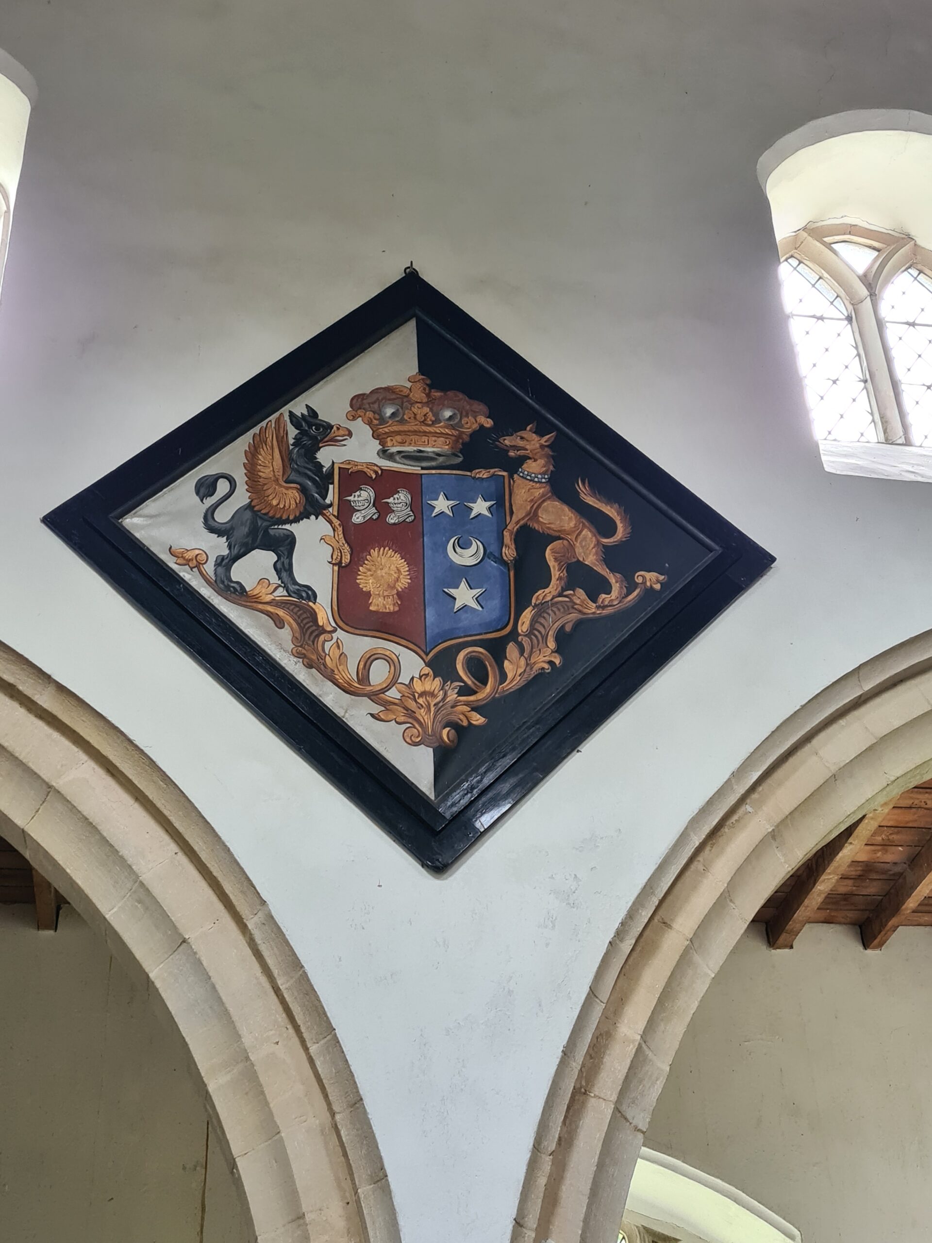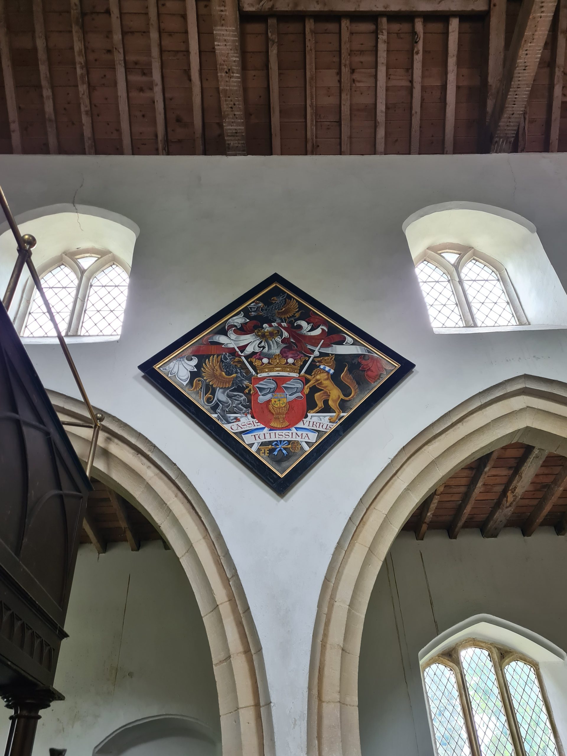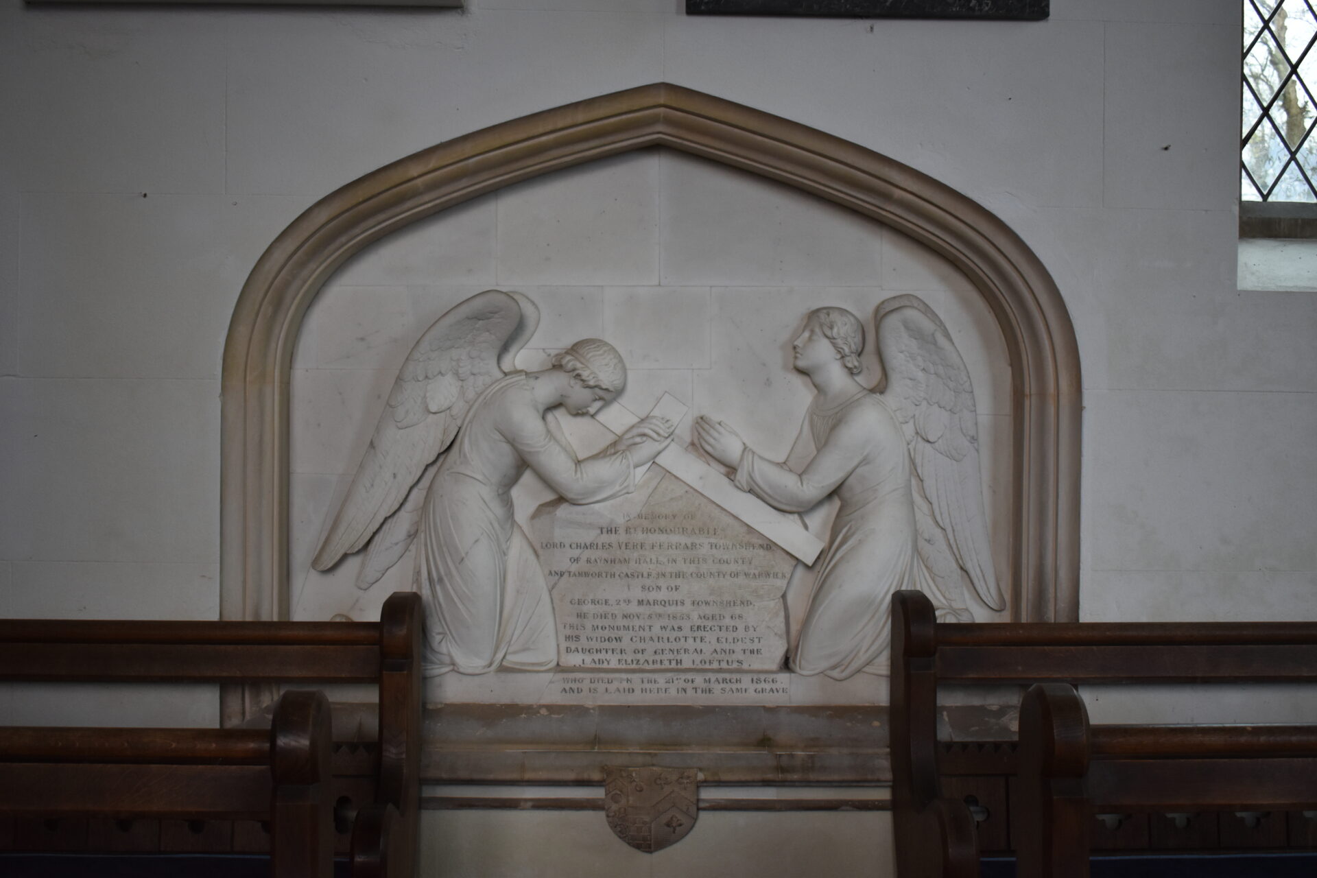 The Church of St Martin at Tours is situated in the extensive deer park of Houghton Hall and continues to serve as the parish church. There was once a village here before it was moved elsewhere when the Hall was built. The majority of the current building dates to the 19th century but has 13th century origins. The tower was added by Sir Robert Walpole. In the nave is an impressive life-sized effigy of the Prior of Coxford who died in 1307, brought to the church before the Dissolution of the Monasteries. Notice the dragon at his feet. There is an impressive array of hatchments on the walls of the nave. In the second half of the 17th century it became the custom for those entitled to bear a coat of arms to be commemorated on his or her death by a funeral hatchment, a diamond-shaped board depicting the arms. It was set up over the entrance to the house of the deceased, and remained there for about a year, after which it was taken to the church and hung on the wall. This custom continued for around two hundred years. If married, the husband’s coat of arms is placed on the left from the viewer’s perspective and the wife’s on the right. The background of each half is either black if the person is deceased or white if they are alive. Sir Robert, his two wives, his brother Galfridus and his successors, the 2nd, 3rd and 4th Earls of Orford are all buried here along with the 5th Marquess of Cholmondeley and his wife, Sybil.