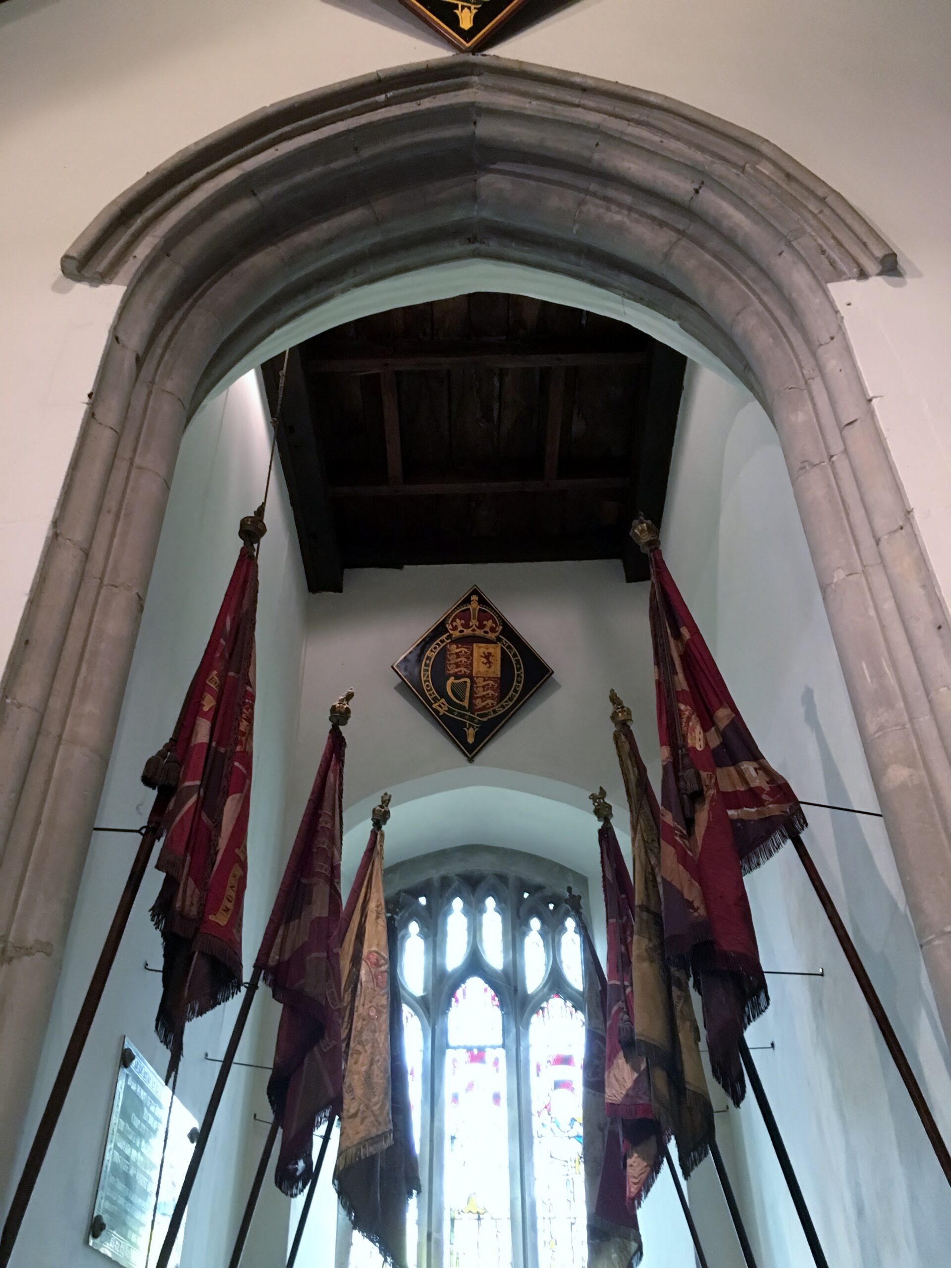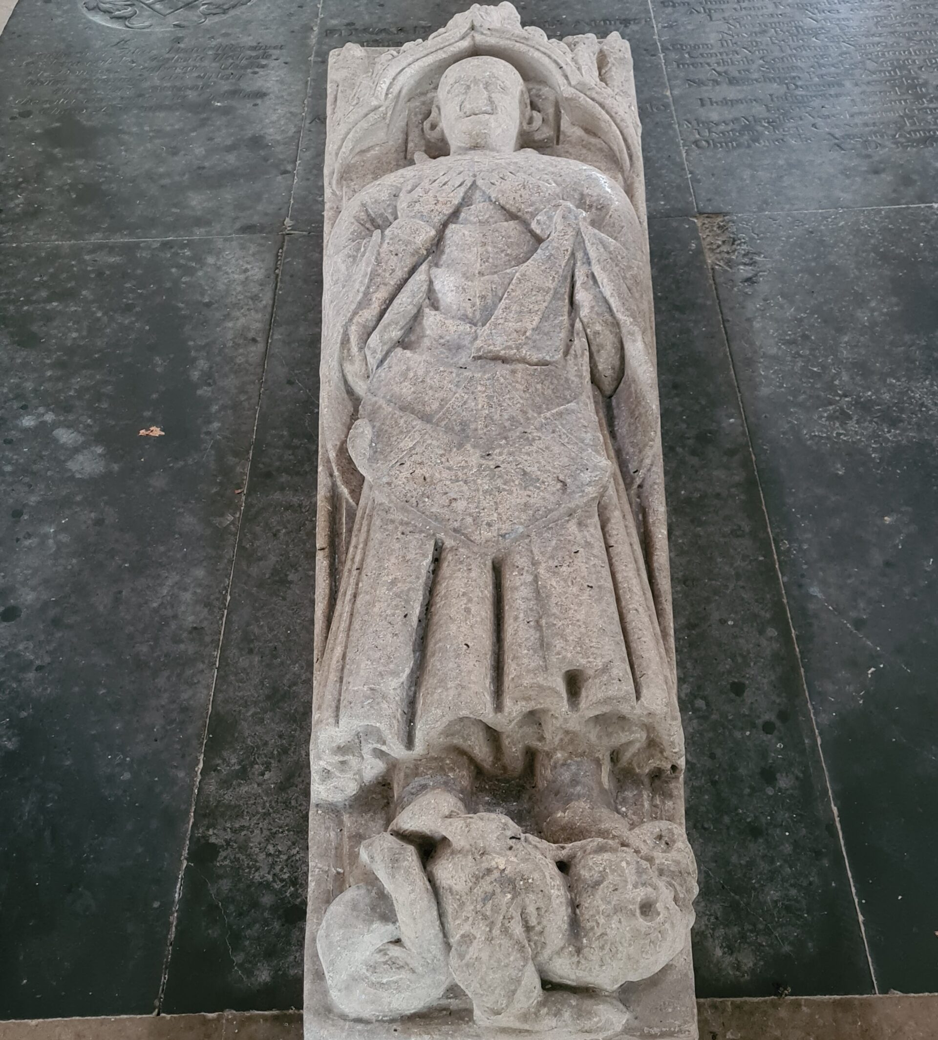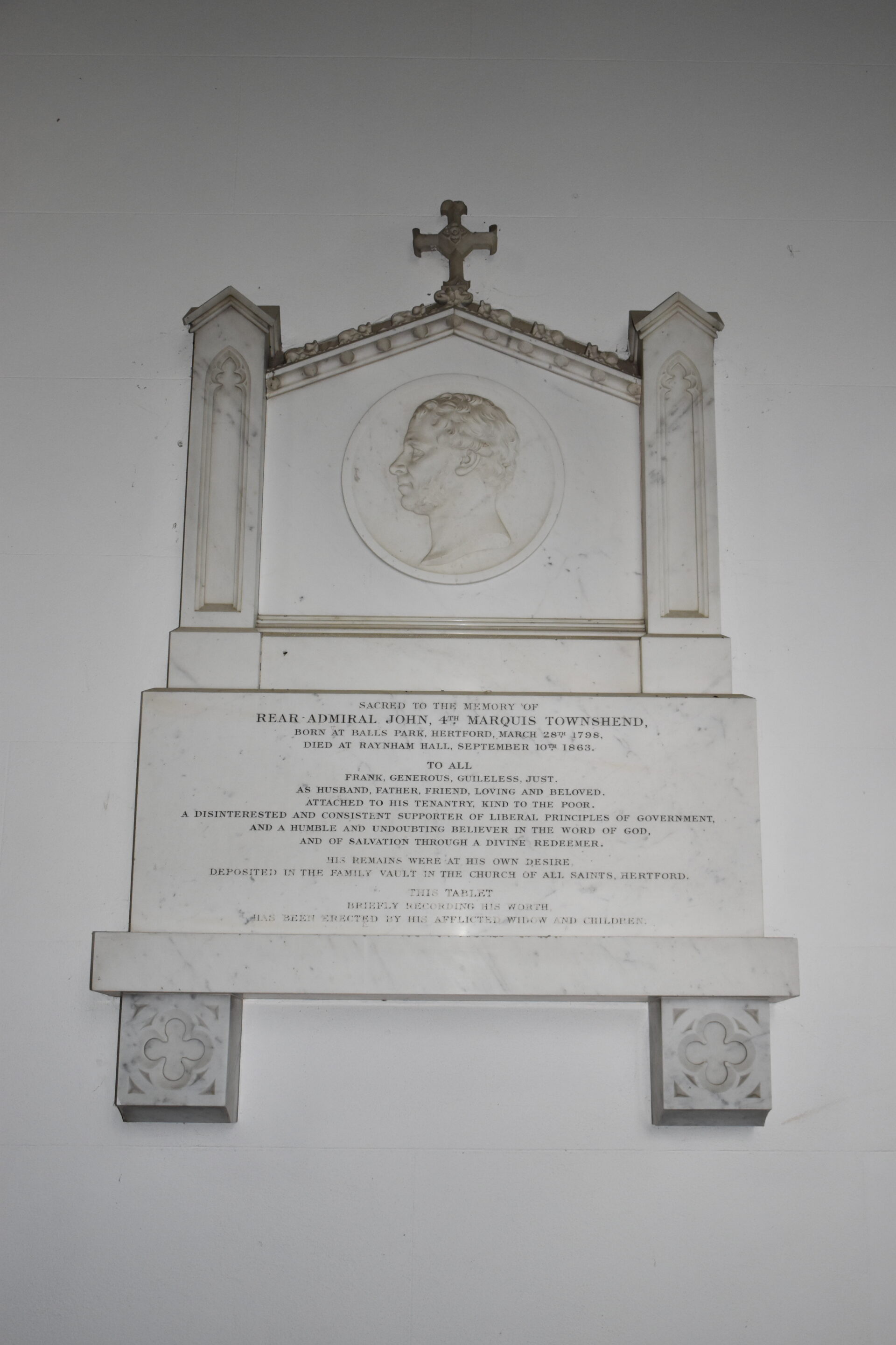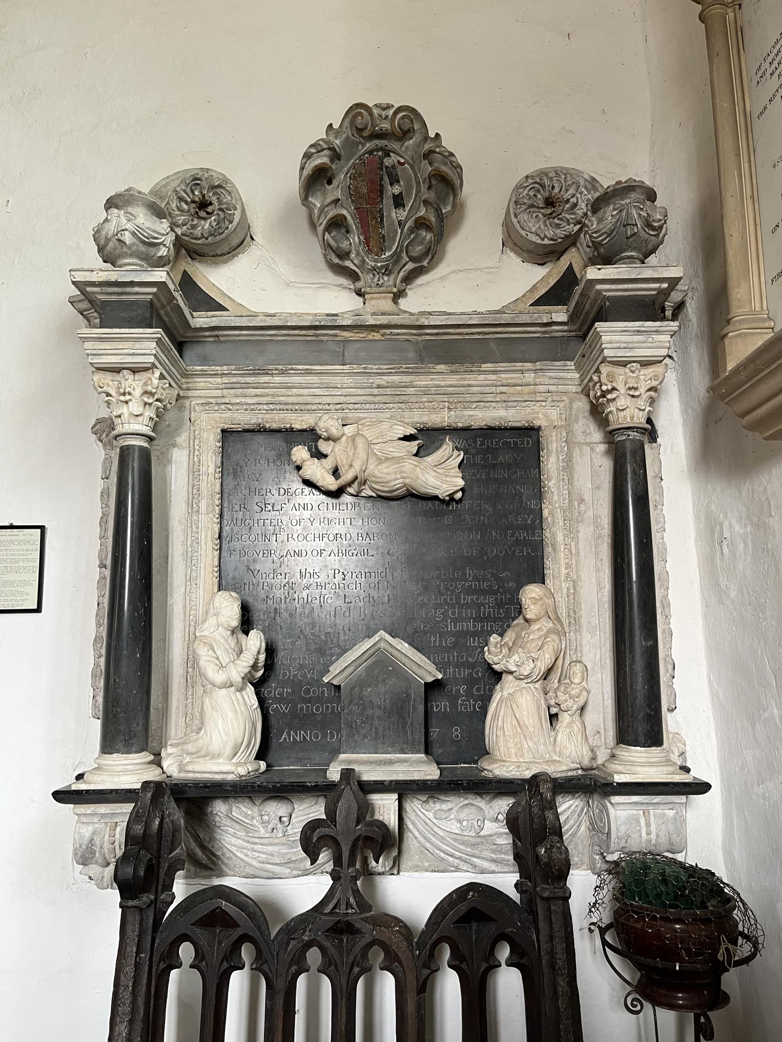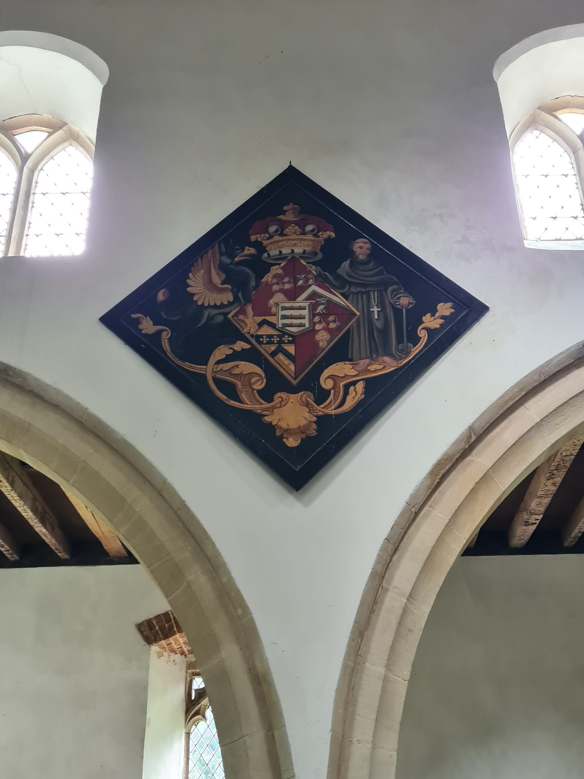 The Church of St Martin at Tours is situated in the extensive deer park of Houghton Hall and continues to serve as the parish church. There was once a village here before it was moved elsewhere when the Hall was built. The majority of the current building dates to the 19th century but has 13th century origins. The tower was added by Sir Robert Walpole. In the nave is an impressive life-sized effigy of the Prior of Coxford who died in 1307, brought to the church before the Dissolution of the Monasteries. Notice the dragon at his feet. There is an impressive array of hatchments on the walls of the nave. In the second half of the 17th century it became the custom for those entitled to bear a coat of arms to be commemorated on his or her death by a funeral hatchment, a diamond-shaped board depicting the arms. It was set up over the entrance to the house of the deceased, and remained there for about a year, after which it was taken to the church and hung on the wall. This custom continued for around two hundred years. If married, the husband’s coat of arms is placed on the left from the viewer’s perspective and the wife’s on the right. The background of each half is either black if the person is deceased or white if they are alive. Sir Robert, his two wives, his brother Galfridus and his successors, the 2nd, 3rd and 4th Earls of Orford are all buried here along with the 5th Marquess of Cholmondeley and his wife, Sybil.