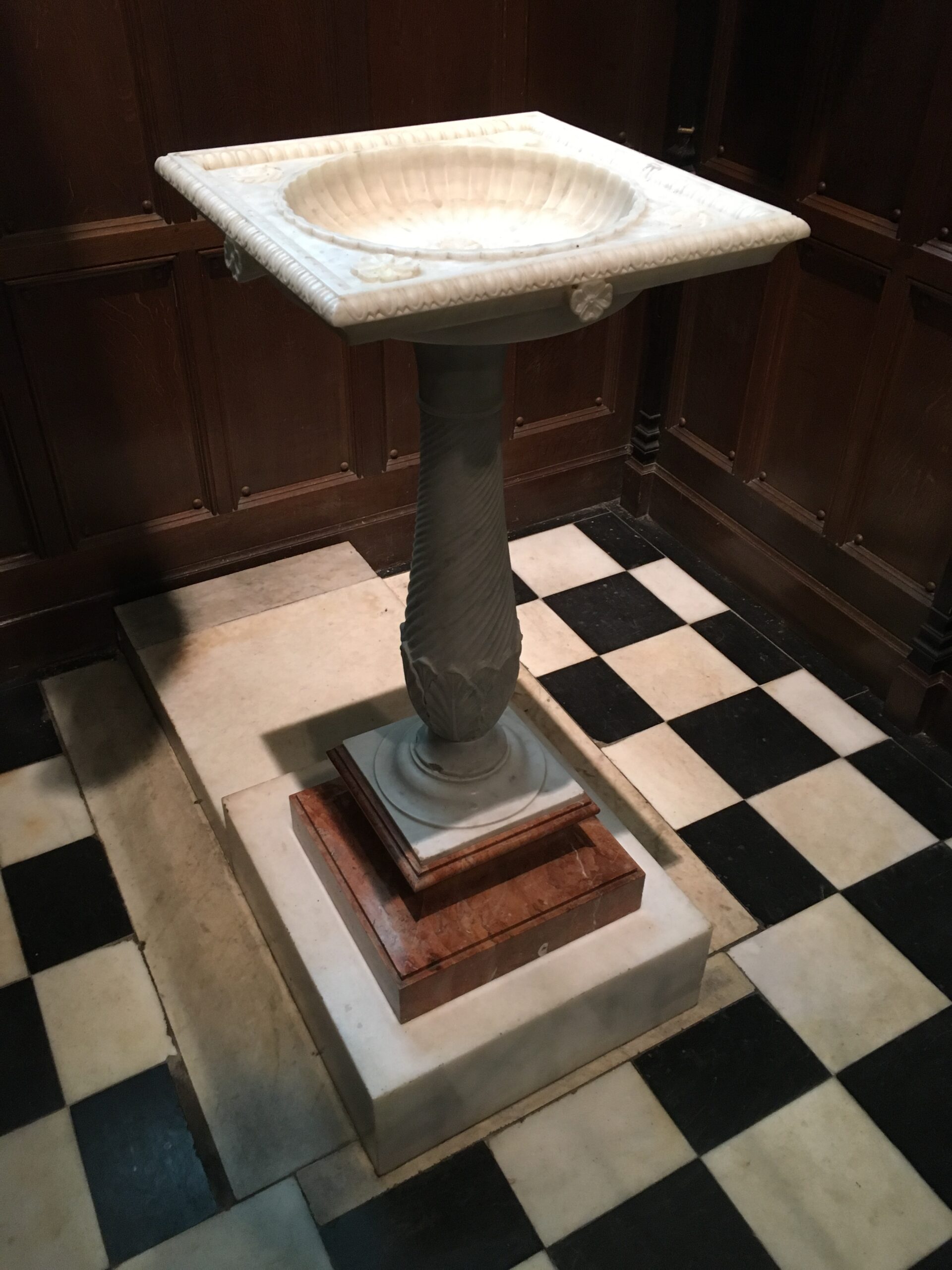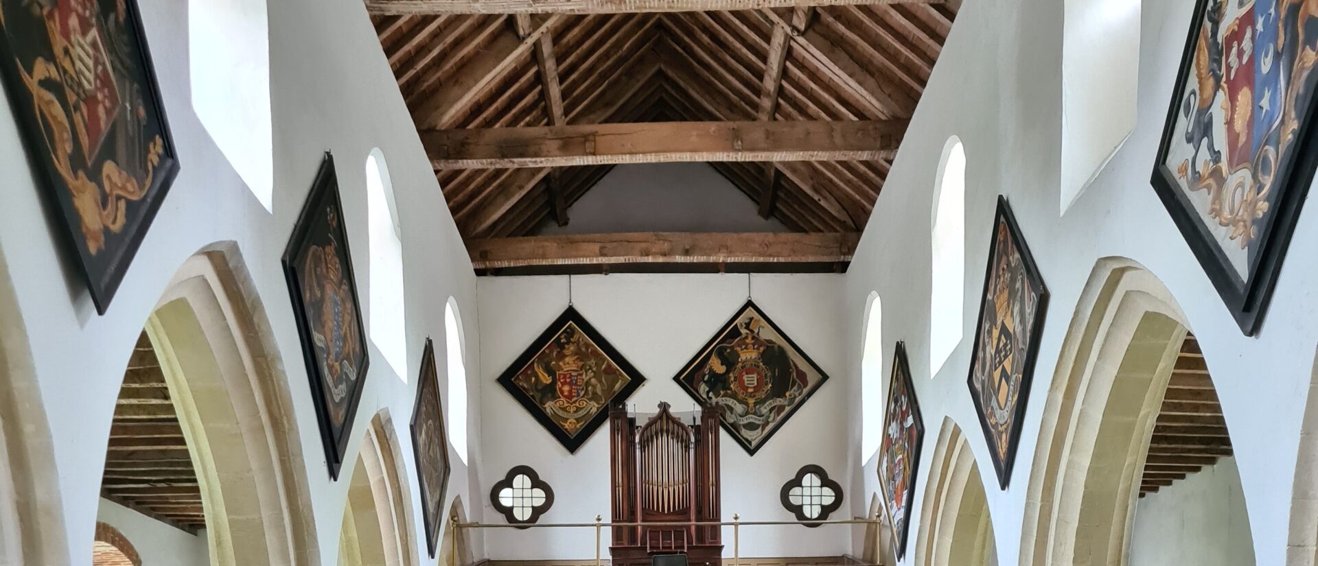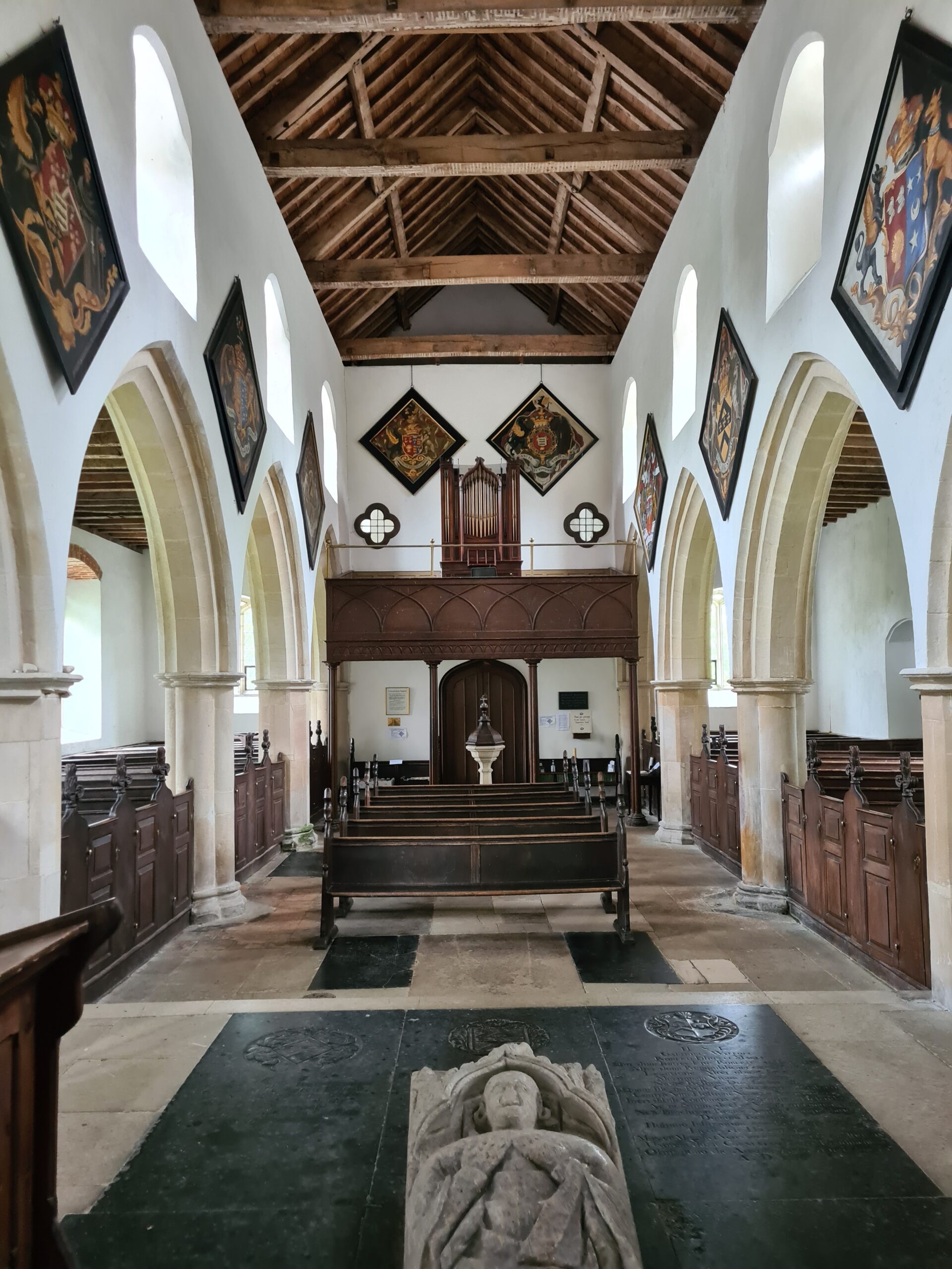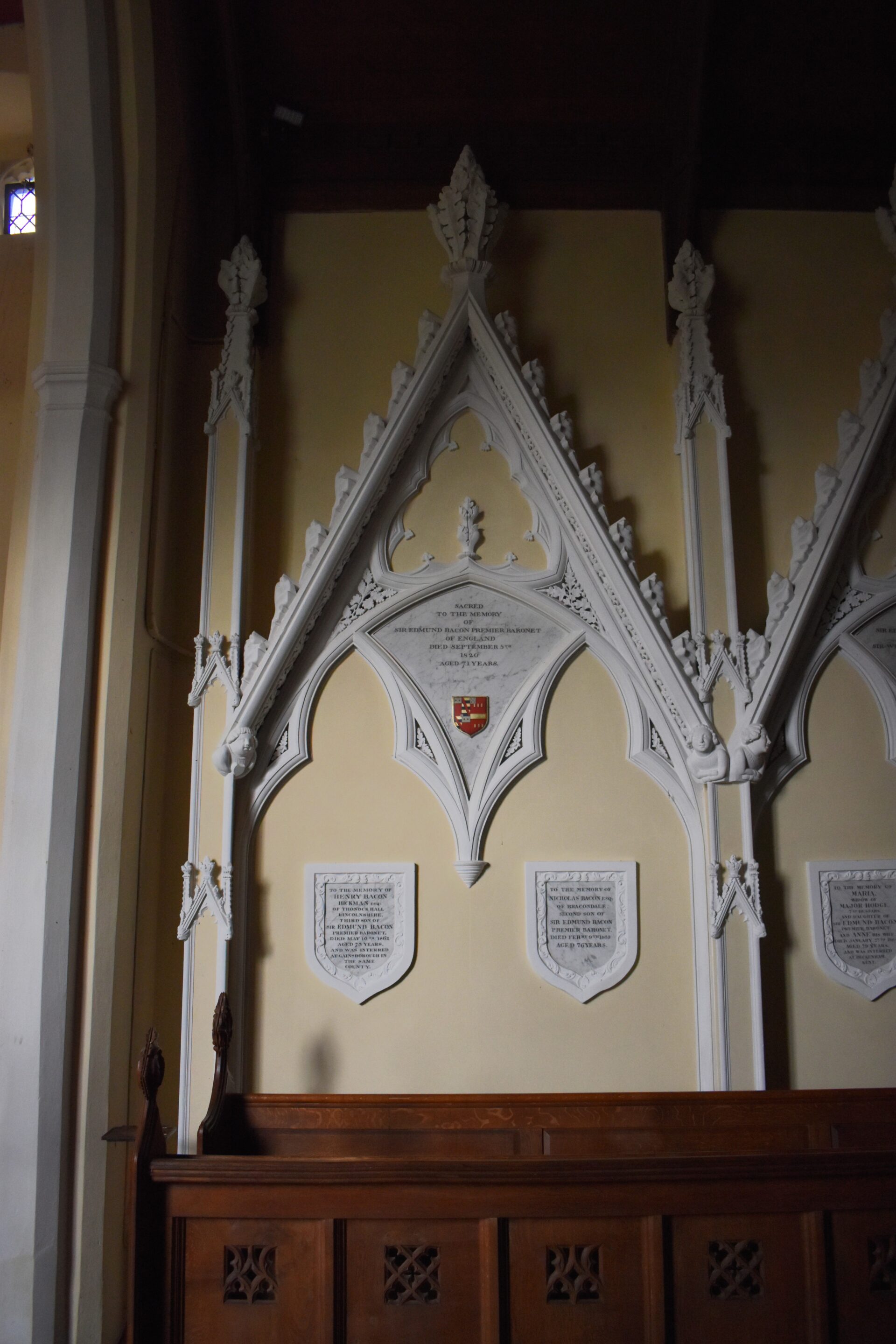 The Church of St Martin at Tours is situated in the extensive deer park of Houghton Hall and continues to serve as the parish church. There was once a village here before it was moved elsewhere when the Hall was built. The majority of the current building dates to the 19th century but has 13th century origins. The tower was added by Sir Robert Walpole. In the nave is an impressive life-sized effigy of the Prior of Coxford who died in 1307, brought to the church before the Dissolution of the Monasteries. Notice the dragon at his feet. There is an impressive array of hatchments on the walls of the nave. In the second half of the 17th century it became the custom for those entitled to bear a coat of arms to be commemorated on his or her death by a funeral hatchment, a diamond-shaped board depicting the arms. It was set up over the entrance to the house of the deceased, and remained there for about a year, after which it was taken to the church and hung on the wall. This custom continued for around two hundred years. If married, the husband’s coat of arms is placed on the left from the viewer’s perspective and the wife’s on the right. The background of each half is either black if the person is deceased or white if they are alive. Sir Robert, his two wives, his brother Galfridus and his successors, the 2nd, 3rd and 4th Earls of Orford are all buried here along with the 5th Marquess of Cholmondeley and his wife, Sybil.