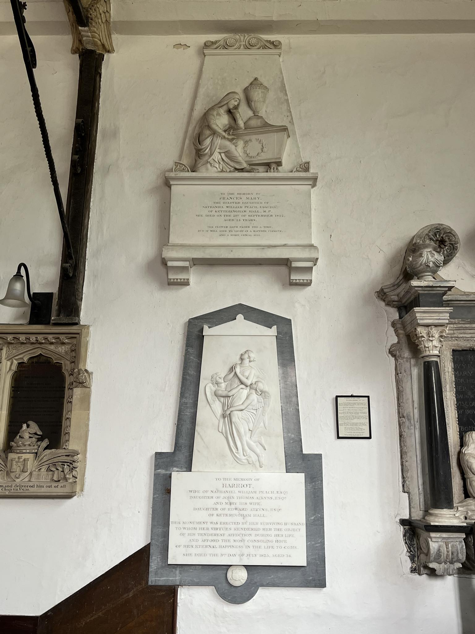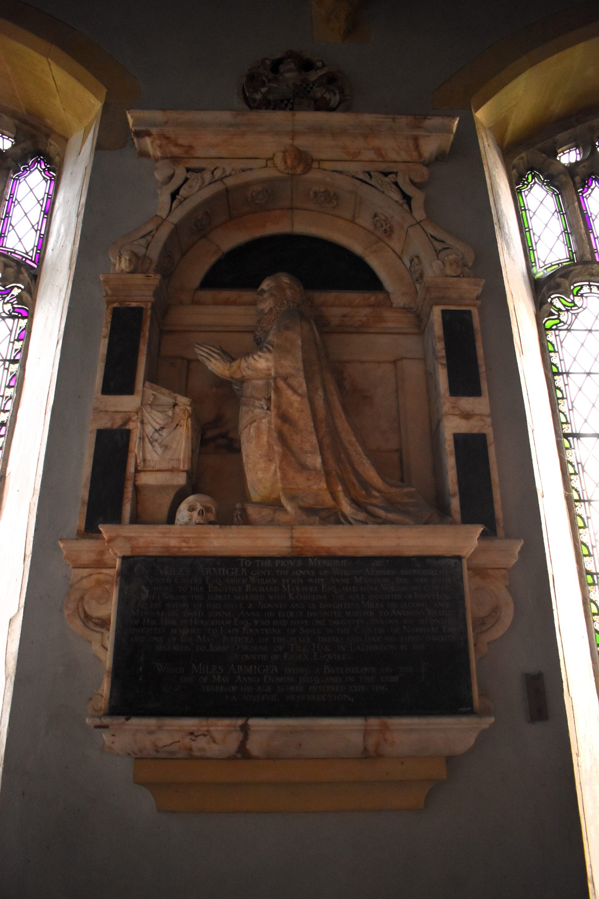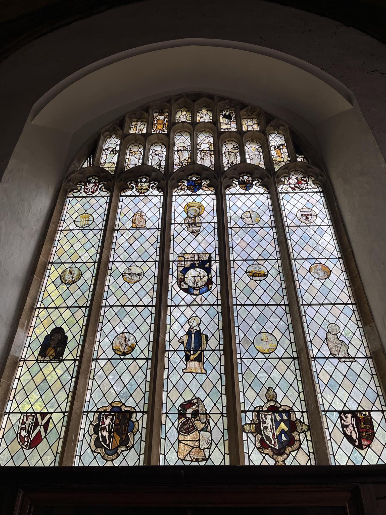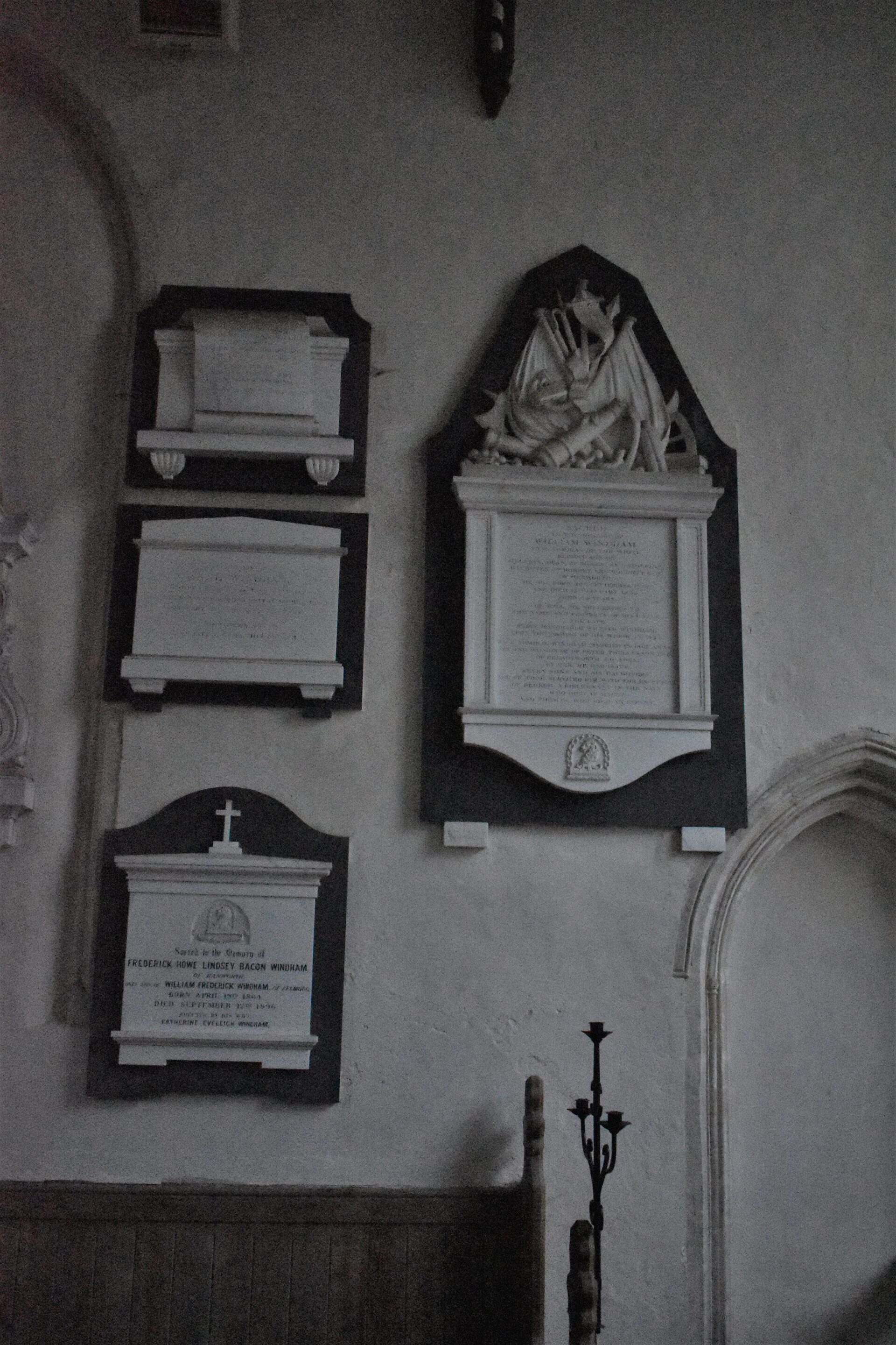 The red brick garden wall of Ketteringham Hall forms the south wall of St Peter’s churchyard. The church is delightful in its proportions and setting, nestled amongst cypress trees and thatched cottages. Look closely and you will see evidence of two blocked Norman windows on the south wall of the nave with small openings framed with flints and rounded arches. The tower was rebuilt in 1609 and the figures standing on top, St Peter and two angels, were added in the 1870s. Floral motifs and shields encircle the 16th century font. The church is overflowing with stories, its walls bedecked in elaborate memorials which reveal the affluence and taste of the owners of the hall from the 14th to the 19th century. Of great interest are the gilded and enamelled brasses commemorating Thomas and Anne Hevenyngham (d. 1499) mounted at the back of the table tomb in the chancel. Five sons kneel with Thomas and five daughters with Anne. Sir William Hevingham (d. 1678) is remembered in a lavish memorial on the north side of the altar. He was on the Parliamentarian side in the English Civil War and present as one of the judges in the trial of Charles I but did not sign the death warrant. Following the Restoration, Sir William’s estates were taken from him and he was imprisoned. Another memorial is that of Drury Lane actress Charlotte Atkyns and states she was a friend of Queen Marie Antoinette of France and made several attempts to rescue her from prison. Intriguing medieval glass survives in the east window and a hand-drawn key mounted on the south west wall of the nave maps the depictions, which include a range of saints and coats of arms.In 1853 a scandal unfolded in Ketteringham. Sir John Boileau of Ketteringham Hall ordered the six bodies buried beneath the chancel to be dug up in the middle of the night and reburied in the churchyard, effectively usurping the occupants to make way for his family, in particular his sick wife. Worshippers soon noticed the smell, as noted in the diary of Revd Wayte Andrew, ‘the stench in the church was insufferable. The long-pent odour of death, released after so many years, hung about the pews like a miasma. The matter could not be hid. Before many hours had passed, the entire village knew what had been done.’ Relatives of the uprooted complained and the Dean of Norwich ordered Sir John to put them back. He then built a mausoleum in the churchyard, which houses his body and that of his wife.