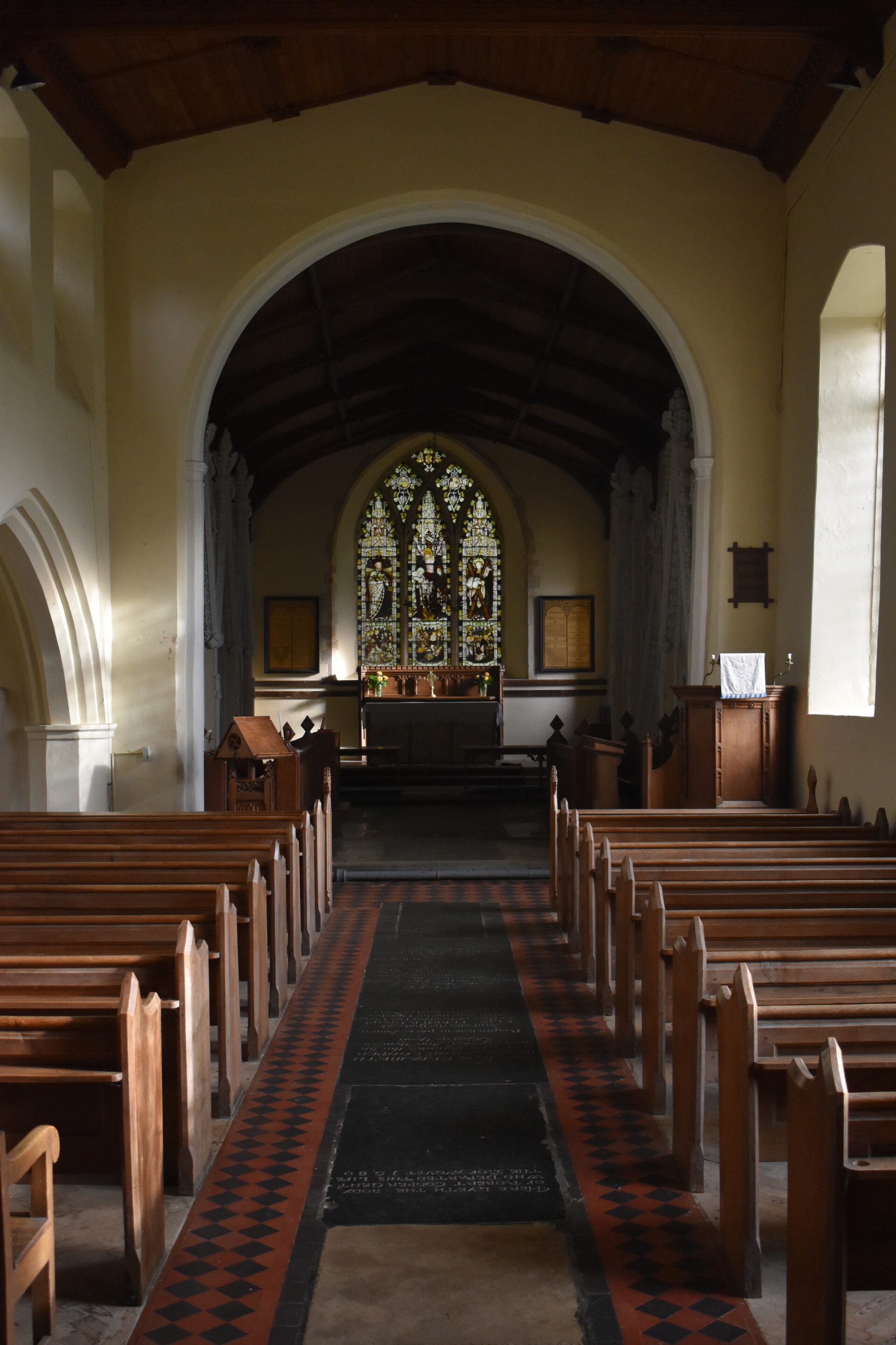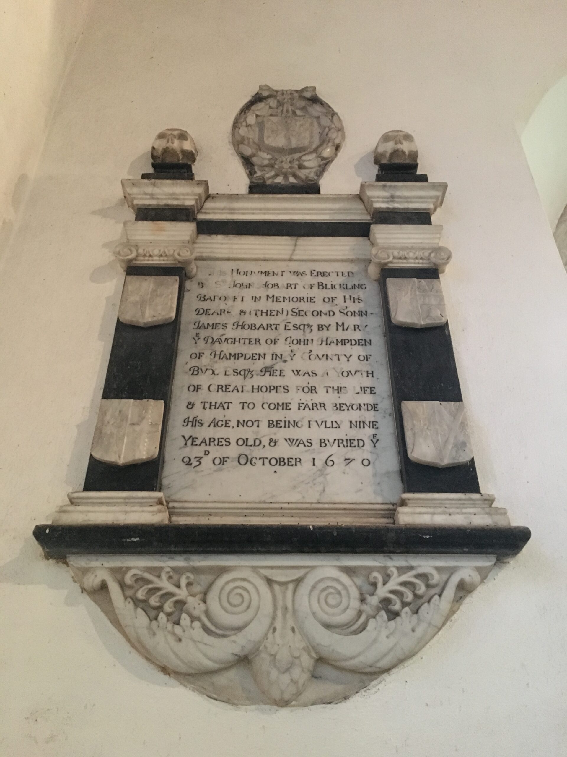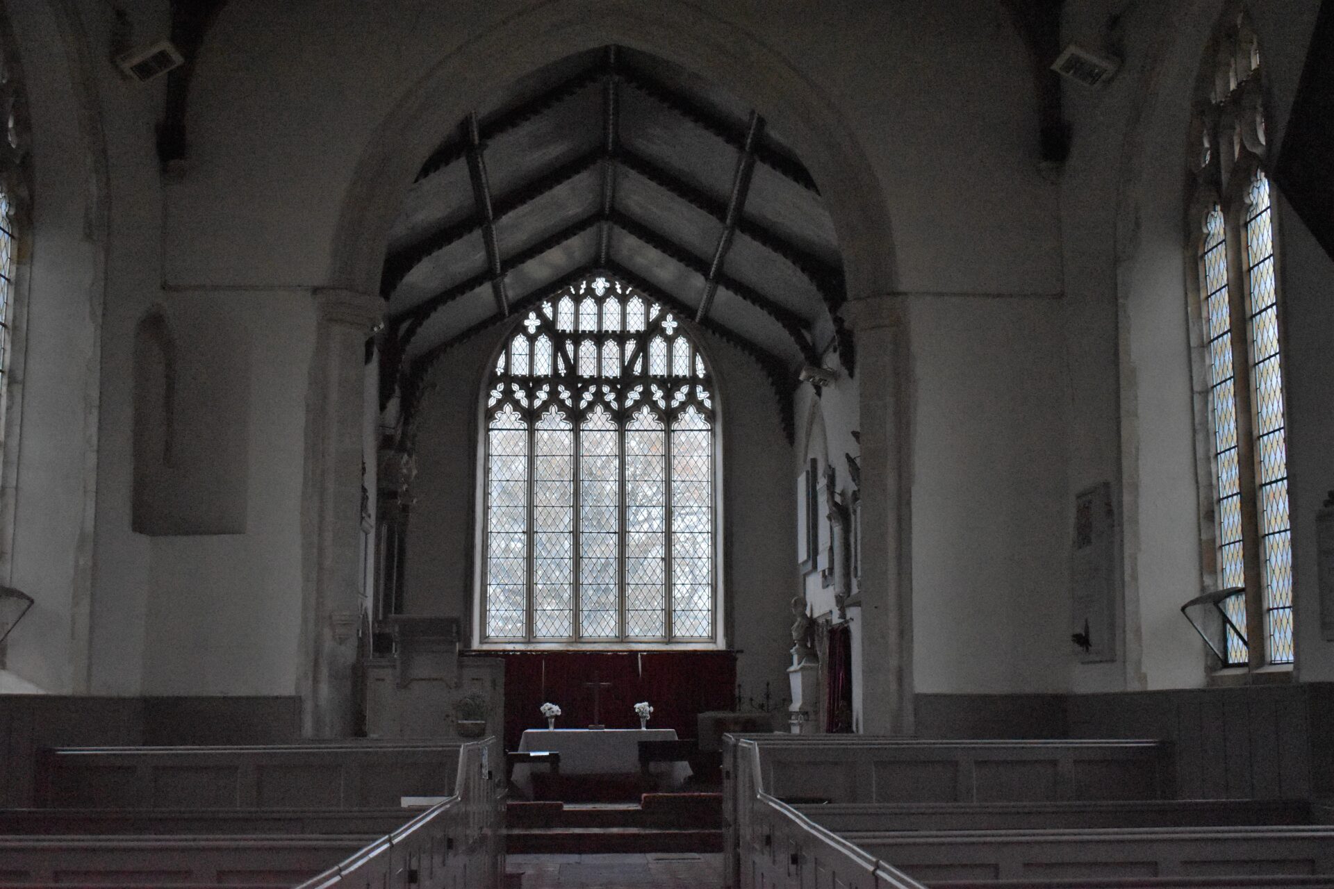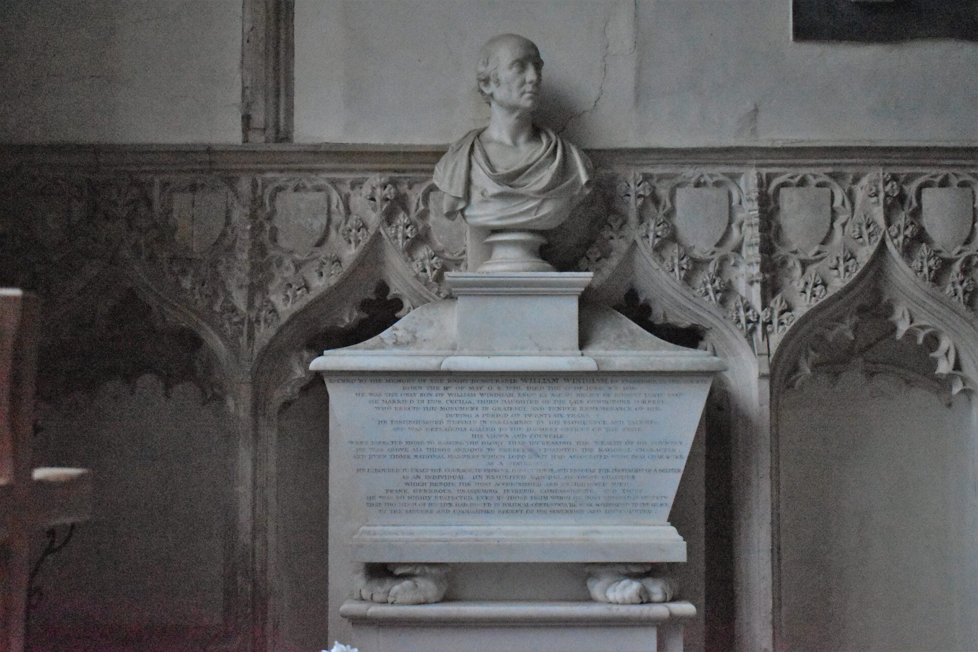 The red brick garden wall of Ketteringham Hall forms the south wall of St Peter’s churchyard. The church is delightful in its proportions and setting, nestled amongst cypress trees and thatched cottages. Look closely and you will see evidence of two blocked Norman windows on the south wall of the nave with small openings framed with flints and rounded arches. The tower was rebuilt in 1609 and the figures standing on top, St Peter and two angels, were added in the 1870s. Floral motifs and shields encircle the 16th century font. The church is overflowing with stories, its walls bedecked in elaborate memorials which reveal the affluence and taste of the owners of the hall from the 14th to the 19th century. Of great interest are the gilded and enamelled brasses commemorating Thomas and Anne Hevenyngham (d. 1499) mounted at the back of the table tomb in the chancel. Five sons kneel with Thomas and five daughters with Anne. Sir William Hevingham (d. 1678) is remembered in a lavish memorial on the north side of the altar. He was on the Parliamentarian side in the English Civil War and present as one of the judges in the trial of Charles I but did not sign the death warrant. Following the Restoration, Sir William’s estates were taken from him and he was imprisoned. Another memorial is that of Drury Lane actress Charlotte Atkyns and states she was a friend of Queen Marie Antoinette of France and made several attempts to rescue her from prison. Intriguing medieval glass survives in the east window and a hand-drawn key mounted on the south west wall of the nave maps the depictions, which include a range of saints and coats of arms.In 1853 a scandal unfolded in Ketteringham. Sir John Boileau of Ketteringham Hall ordered the six bodies buried beneath the chancel to be dug up in the middle of the night and reburied in the churchyard, effectively usurping the occupants to make way for his family, in particular his sick wife. Worshippers soon noticed the smell, as noted in the diary of Revd Wayte Andrew, ‘the stench in the church was insufferable. The long-pent odour of death, released after so many years, hung about the pews like a miasma. The matter could not be hid. Before many hours had passed, the entire village knew what had been done.’ Relatives of the uprooted complained and the Dean of Norwich ordered Sir John to put them back. He then built a mausoleum in the churchyard, which houses his body and that of his wife.