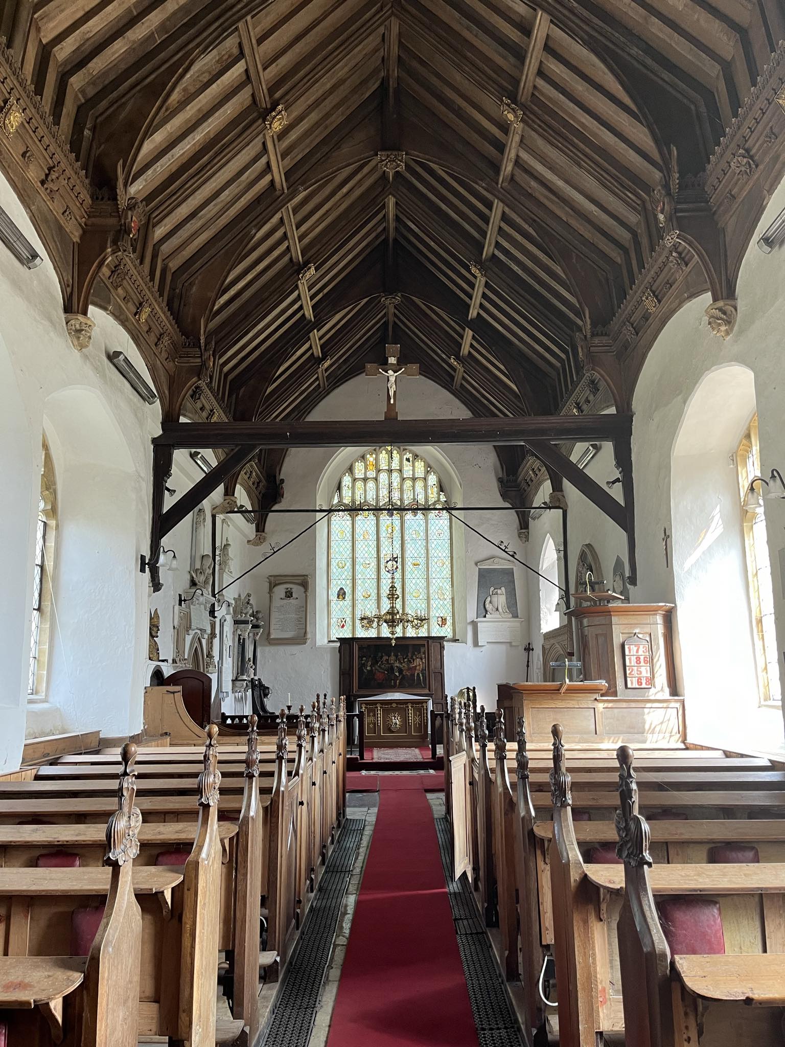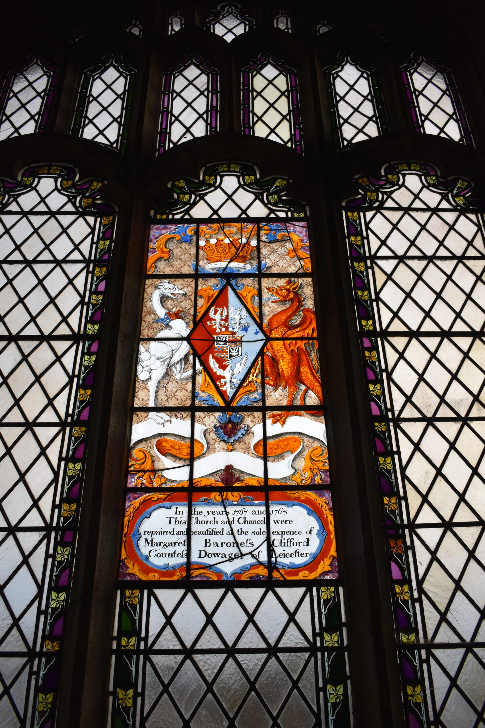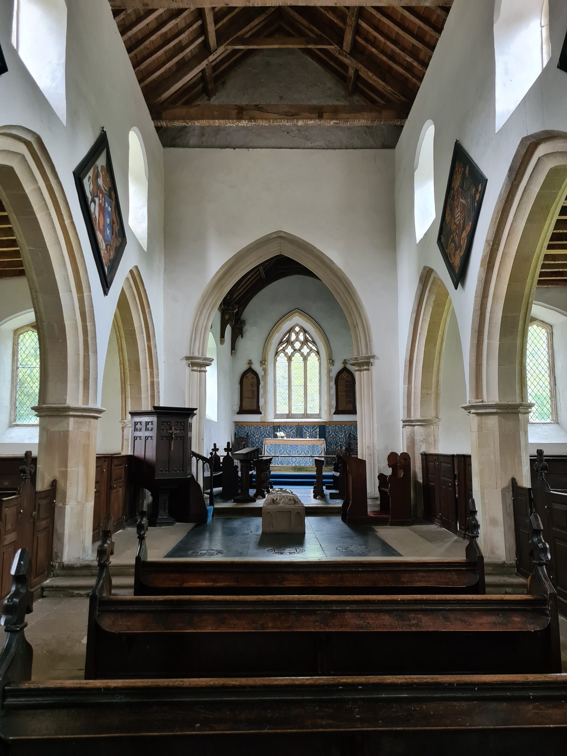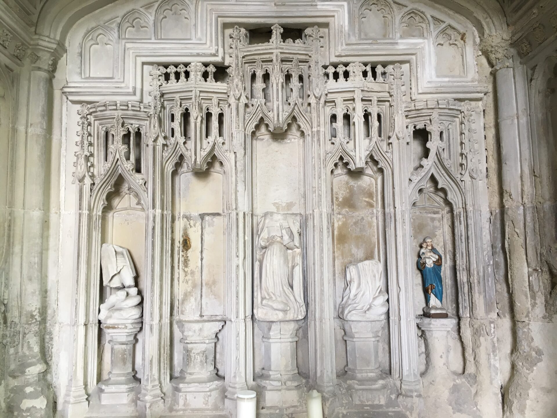 The red brick garden wall of Ketteringham Hall forms the south wall of St Peter’s churchyard. The church is delightful in its proportions and setting, nestled amongst cypress trees and thatched cottages. Look closely and you will see evidence of two blocked Norman windows on the south wall of the nave with small openings framed with flints and rounded arches. The tower was rebuilt in 1609 and the figures standing on top, St Peter and two angels, were added in the 1870s. Floral motifs and shields encircle the 16th century font. The church is overflowing with stories, its walls bedecked in elaborate memorials which reveal the affluence and taste of the owners of the hall from the 14th to the 19th century. Of great interest are the gilded and enamelled brasses commemorating Thomas and Anne Hevenyngham (d. 1499) mounted at the back of the table tomb in the chancel. Five sons kneel with Thomas and five daughters with Anne. Sir William Hevingham (d. 1678) is remembered in a lavish memorial on the north side of the altar. He was on the Parliamentarian side in the English Civil War and present as one of the judges in the trial of Charles I but did not sign the death warrant. Following the Restoration, Sir William’s estates were taken from him and he was imprisoned. Another memorial is that of Drury Lane actress Charlotte Atkyns and states she was a friend of Queen Marie Antoinette of France and made several attempts to rescue her from prison. Intriguing medieval glass survives in the east window and a hand-drawn key mounted on the south west wall of the nave maps the depictions, which include a range of saints and coats of arms.In 1853 a scandal unfolded in Ketteringham. Sir John Boileau of Ketteringham Hall ordered the six bodies buried beneath the chancel to be dug up in the middle of the night and reburied in the churchyard, effectively usurping the occupants to make way for his family, in particular his sick wife. Worshippers soon noticed the smell, as noted in the diary of Revd Wayte Andrew, ‘the stench in the church was insufferable. The long-pent odour of death, released after so many years, hung about the pews like a miasma. The matter could not be hid. Before many hours had passed, the entire village knew what had been done.’ Relatives of the uprooted complained and the Dean of Norwich ordered Sir John to put them back. He then built a mausoleum in the churchyard, which houses his body and that of his wife.