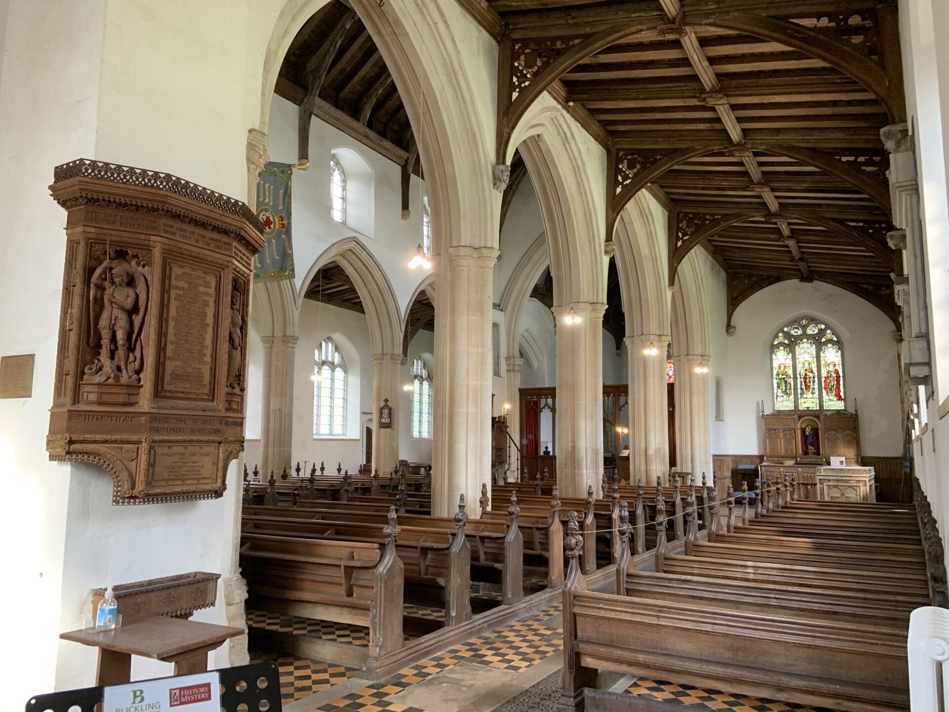 St Andrew’s Church is situated next to the entrance to Blickling Hall. The majority of the exterior is Victorian. Inside, the large memorial depicting two life-size angels is dedicated to the 8th Marquess of Lothian but he is buried elsewhere. The church boasts a collection of replica brasses. One commemorates Sir Nicholas Dagworth (d. 1401) who built the first Blickling Hall, in full armour with a lion at his feet. Anne Astley (d. 1512) is depicted with two babies as she died after the birth of twins. Another to Roger and Cecily Felthorpe (d. 1454) shows them alongside their sixteen children. Other brasses include those to members of the Boleyn family. In the chancel, a hand-less bust commemorates Elizabeth Gurden in a cap and ruff in the style of the late 16th century. Look out for the carved eagle and young on one of the piscina arches. The pulpit dates to the 17th century.