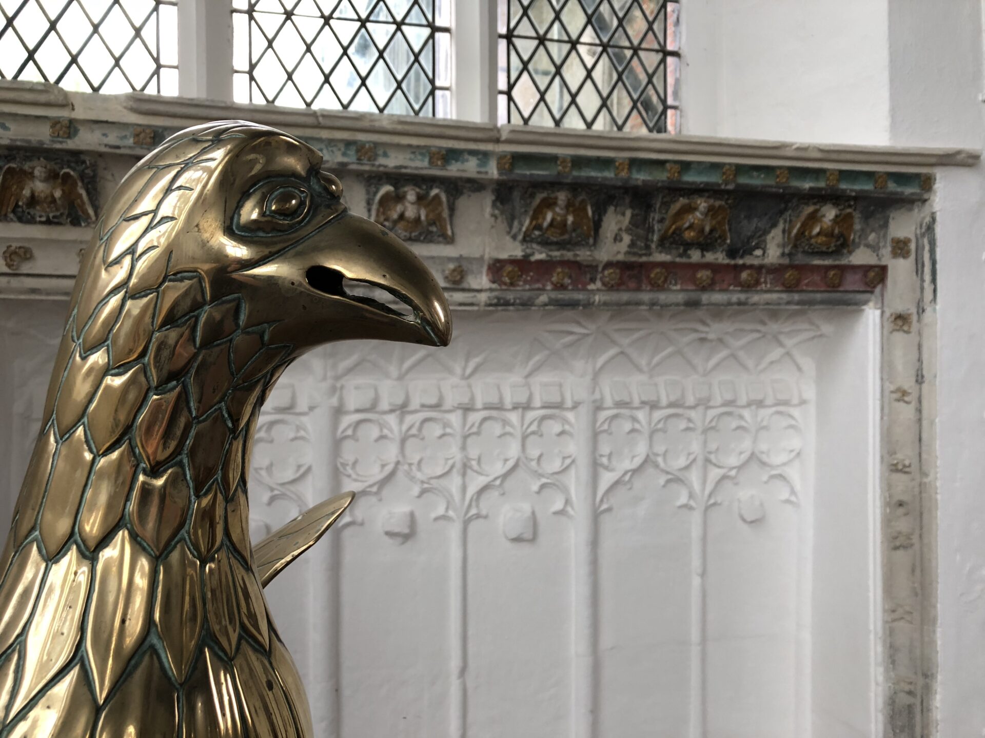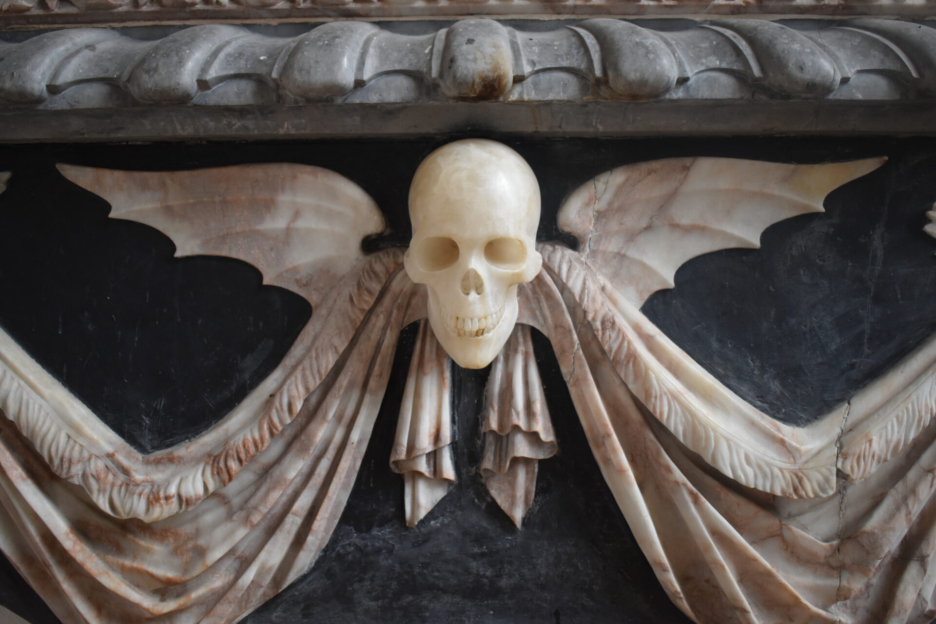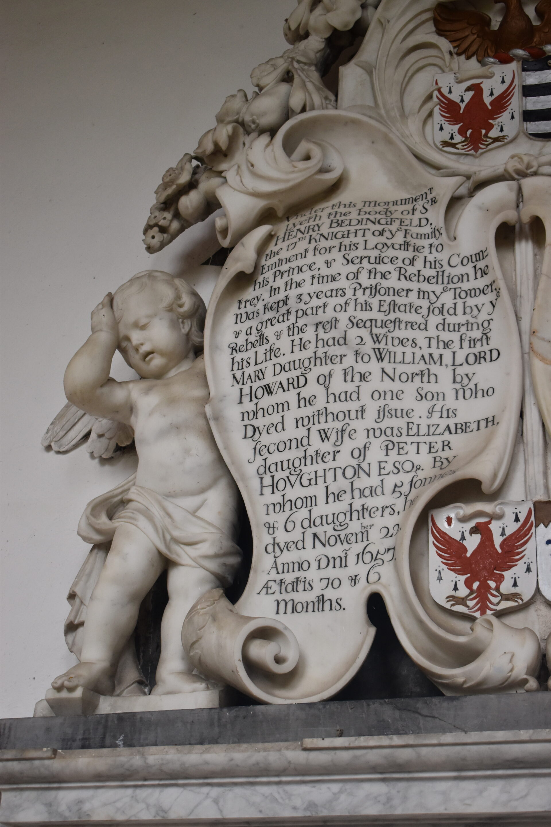 The spire of this large church collapsed in 1948, partially ruining the nave and leaving the picturesque ruins you see today. Worship became confined to the chancel and Bedingfeld Chapel at the east end of the south aisle. The rood screen was taken to St Nicholas’ Church in Dereham. Notice the carved floral pattern and angels on the piscina arch. The lectern, made by an East Anglian craftsman, dates from the 15th century. It features three lions and an eagle which has lost its claws. The crowning glory of St John’s Church is the Bedingfeld Chapel. An ornate terracotta tomb partitions the chancel from the chapel and another forms a western screen. These terracotta tombs, in the Renaissance style, are the finest examples in the country and comprise crested canopies, cherubs, dolphins and pilasters. The Bedingfelds, who still live in nearby Oxburgh Hall, were a prominent Catholic family. In 1513, Margaret Bedingfeld left directions in her will to be buried ‘where I will a chapel to be erected.’ Simple Perpendicular windows light the space. A memorial to Henry Bedingfeld (d. 1704) and his wives blocks most of the east window. It is framed with acanthus leaves and adorned with scrolls and shields. Underneath, a skull has unfurled its bat wings and sits between cherubs with feathered wings.