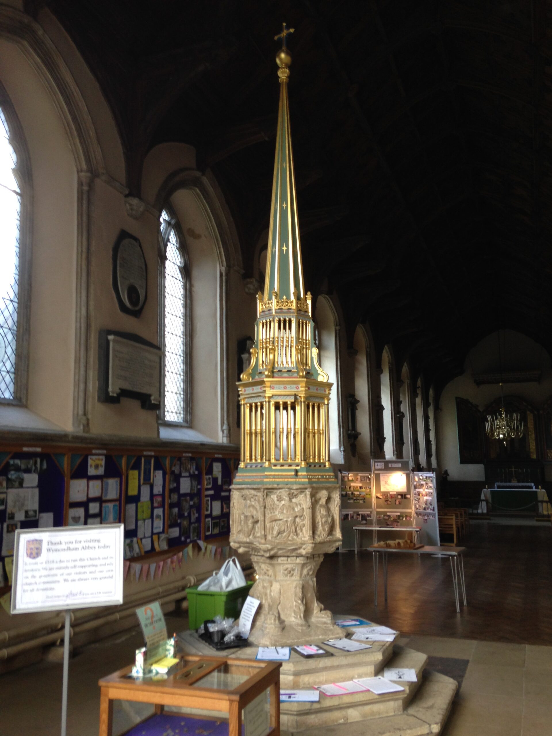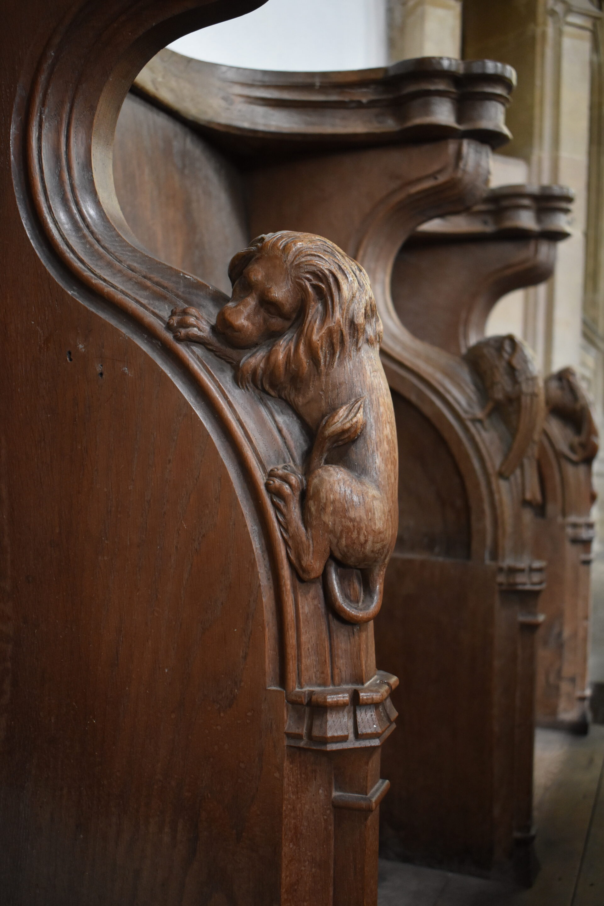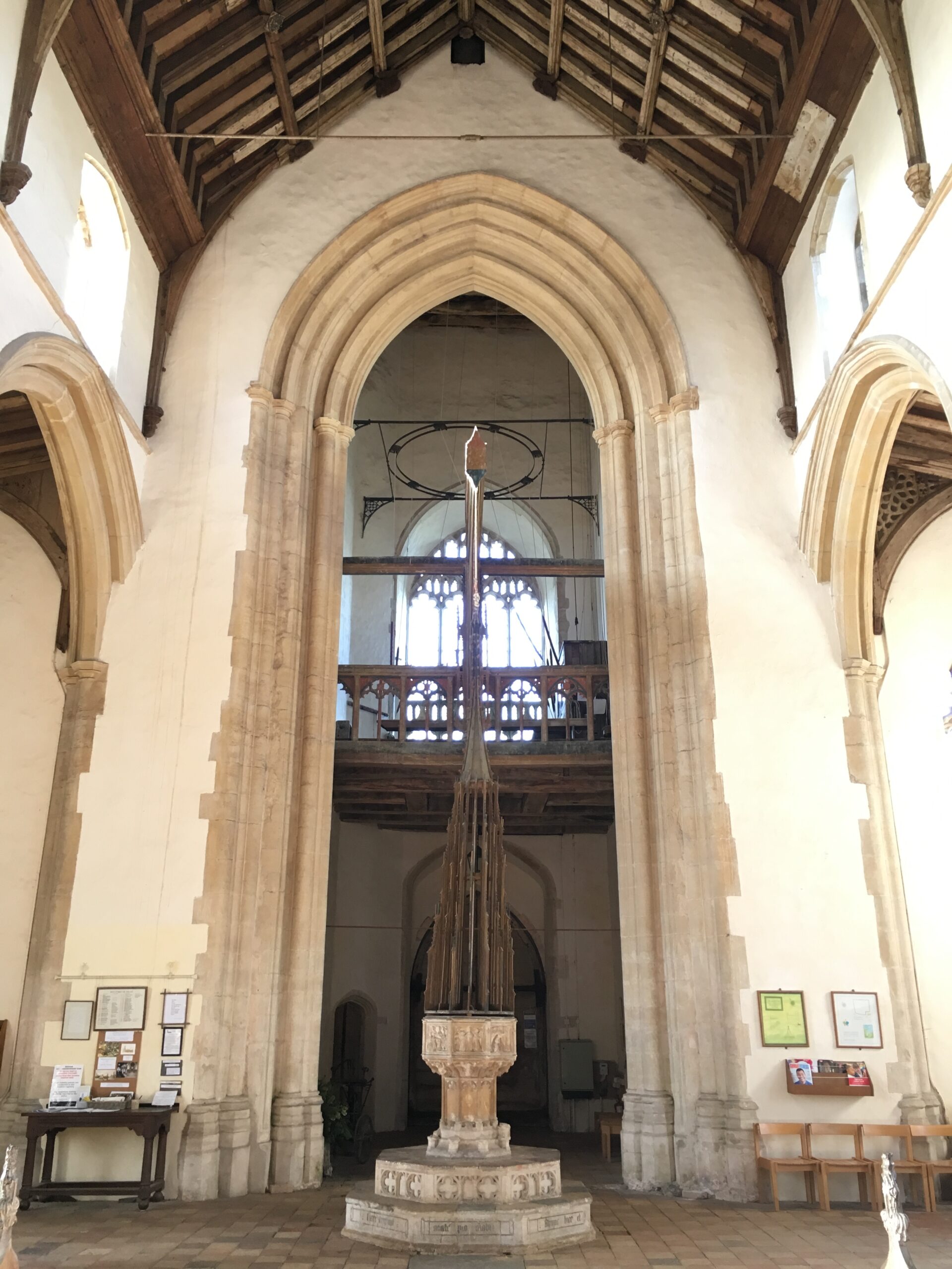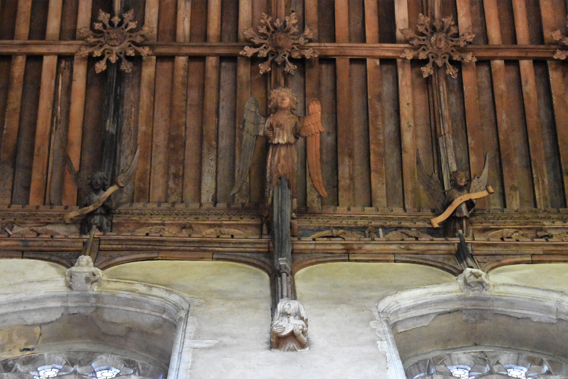The buildings known as Wymondham Abbey are the remains of a Benedictine monastery, founded in 1107 by William d’Albini, whose brother was the Abbot of St Albans. Excavations in 2002 discovered the fabric of a late Saxon or Norman church beneath the nave of the current church, and an earlier burial indicating the presence of a Saxon church nearby. The north aisle and nave were used by the town, and the chancel was used by the monks of the abbey. This dual usage caused much tension and produced two towers, one at either end of the nave, which results in the dramatic structure that you see today. Originally the church had two western towers with a third over the central crossing. This became unstable in the late 14th century and was rebuilt further west. The two western towers were replaced by the existing 142ft western tower from 1448 onwards. Following the Dissolution of the Monasteries in the 1530s, the eastern section of the church and the monastic buildings were demolished and the eastern tower fell into disuse. The nave continued to serve as the parish church, dedicated to St Mary and St Thomas of Canterbury. Surviving masonry elements include the south wall of the refectory and at least three unidentified buildings. The interior of the church does not disappoint, boasting a stunning gilded altar screen by the great Gothic Revival architect Ninian Comper, a 15th century hammerbeam roof with a host of angels, and a 15th century font complete with carvings of the symbols of the Evangelists, lions and woodwoses. Notice the Norman pillars at the west end of the nave which have retained their original shape. Look up at the eastern end of the triforium on the south side and you will see the window from the monks’ dormitory that they looked through to spy on the parish. In the south aisle a variety of creatures serve as pew ends.