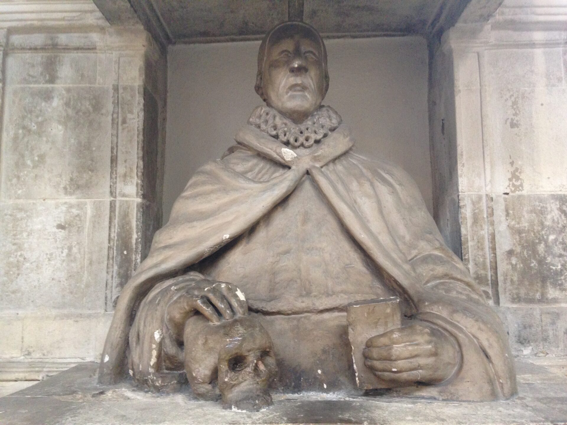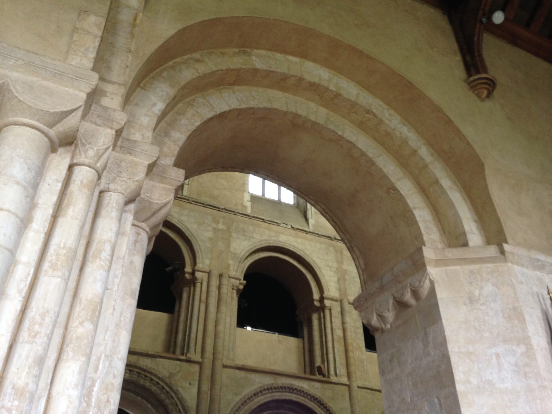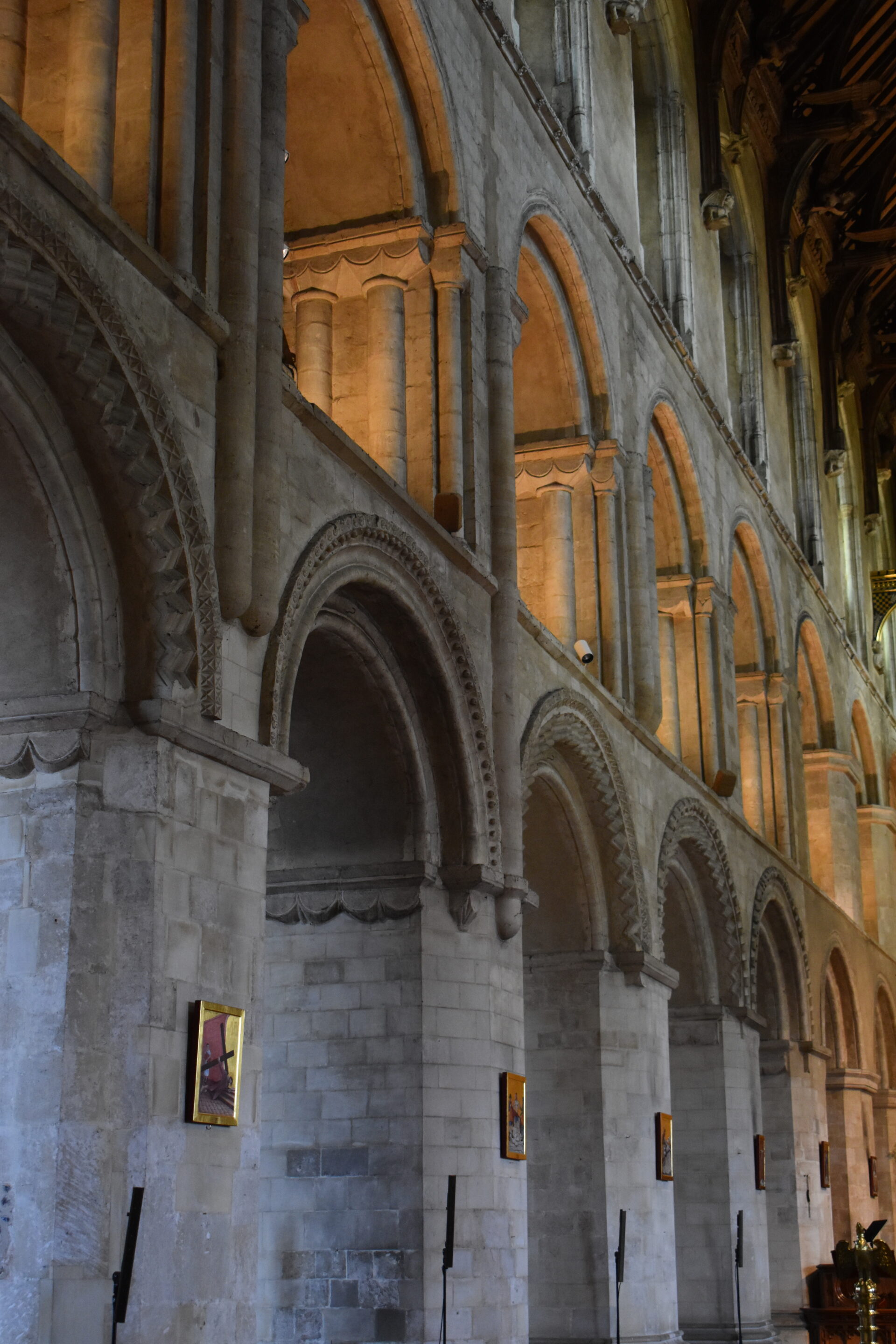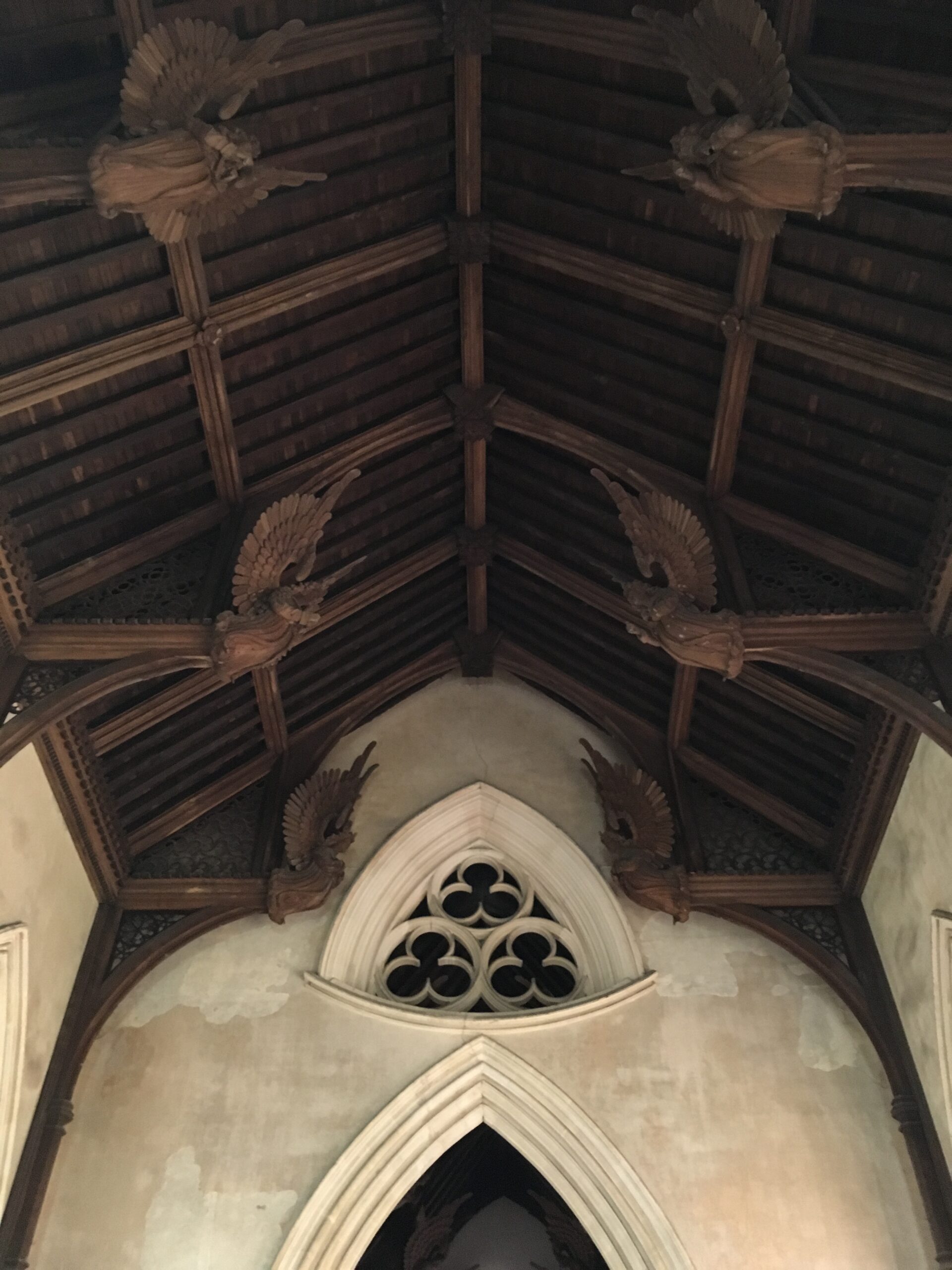 The buildings known as Wymondham Abbey are the remains of a Benedictine monastery, founded in 1107 by William d’Albini, whose brother was the Abbot of St Albans. Excavations in 2002 discovered the fabric of a late Saxon or Norman church beneath the nave of the current church, and an earlier burial indicating the presence of a Saxon church nearby. The north aisle and nave were used by the town, and the chancel was used by the monks of the abbey. This dual usage caused much tension and produced two towers, one at either end of the nave, which results in the dramatic structure that you see today. Originally the church had two western towers with a third over the central crossing. This became unstable in the late 14th century and was rebuilt further west. The two western towers were replaced by the existing 142ft western tower from 1448 onwards. Following the Dissolution of the Monasteries in the 1530s, the eastern section of the church and the monastic buildings were demolished and the eastern tower fell into disuse. The nave continued to serve as the parish church, dedicated to St Mary and St Thomas of Canterbury. Surviving masonry elements include the south wall of the refectory and at least three unidentified buildings. The interior of the church does not disappoint, boasting a stunning gilded altar screen by the great Gothic Revival architect Ninian Comper, a 15th century hammerbeam roof with a host of angels, and a 15th century font complete with carvings of the symbols of the Evangelists, lions and woodwoses. Notice the Norman pillars at the west end of the nave which have retained their original shape. Look up at the eastern end of the triforium on the south side and you will see the window from the monks’ dormitory that they looked through to spy on the parish. In the south aisle a variety of creatures serve as pew ends.