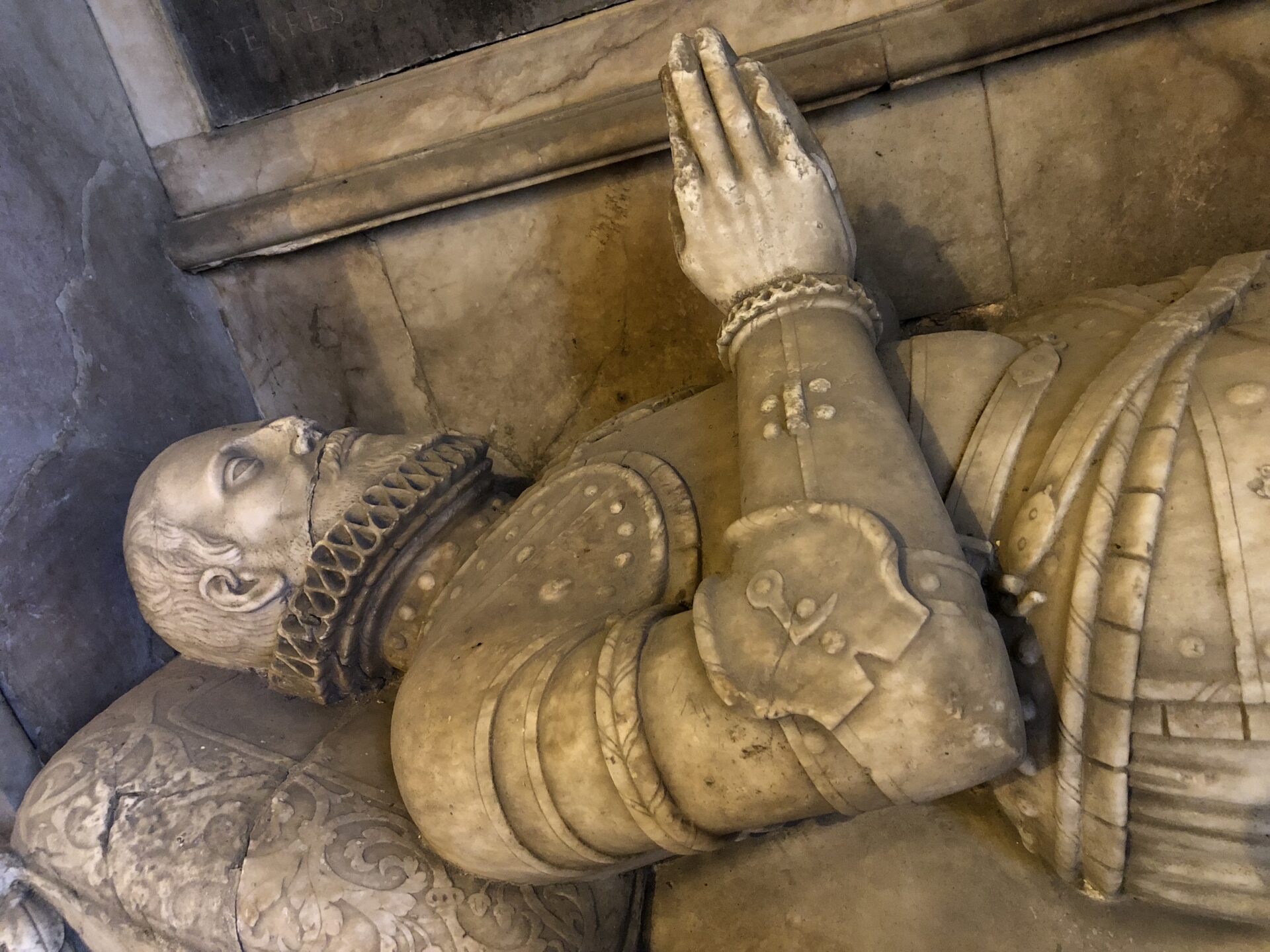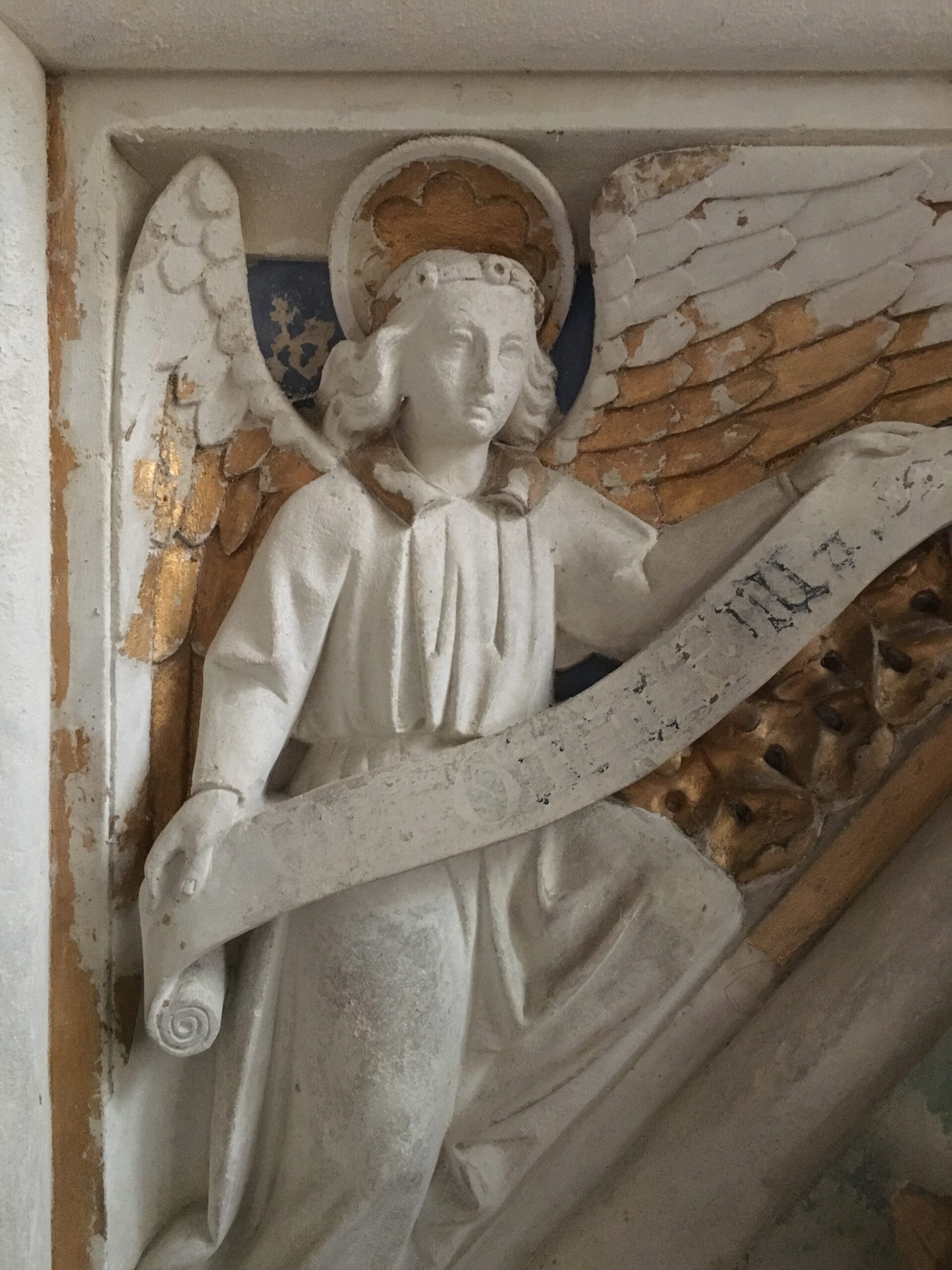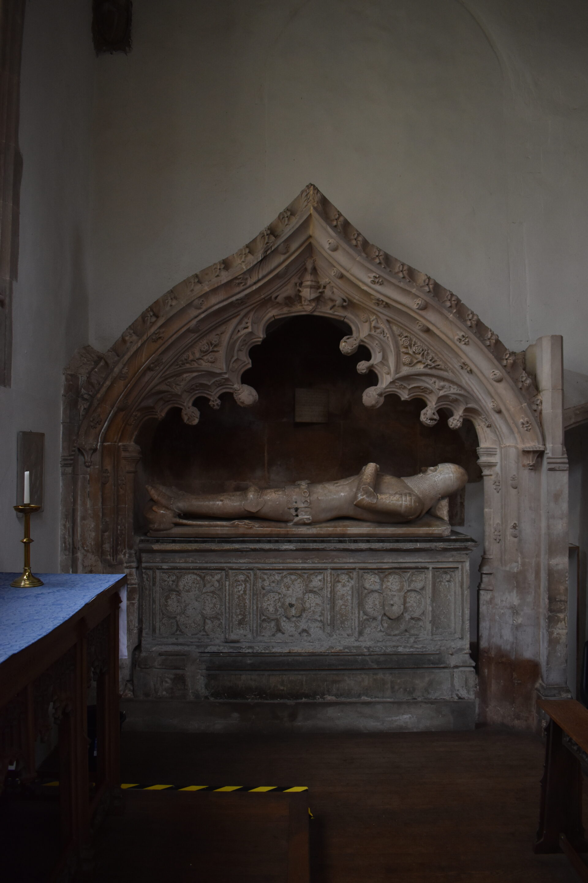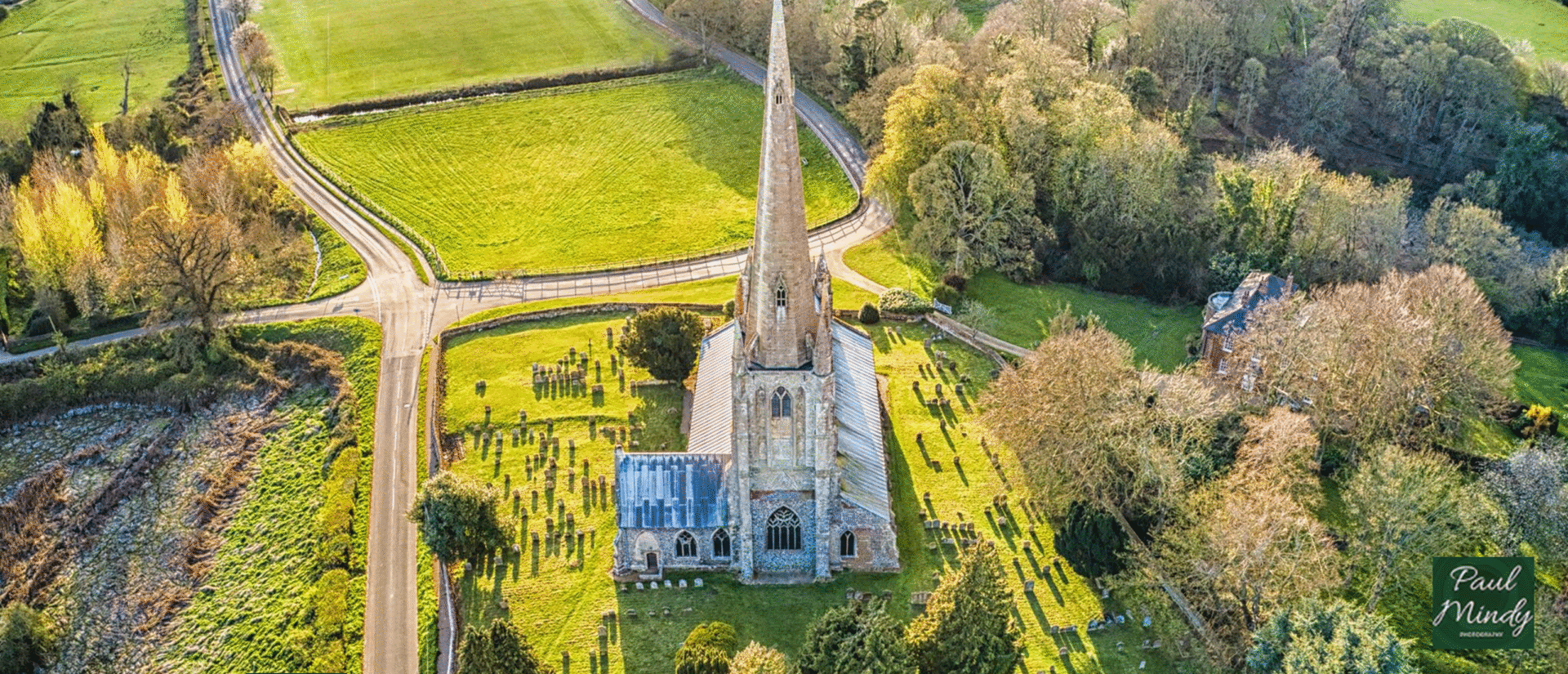 The architectural historian Nikolaus Pevsner called St Mary’s Church “the most exciting 14th century Decorated church in Norfolk.” D.P. Mortlock and C.V. Roberts in their Guide to Norfolk Churches call it ‘the finest coherent example of the Decorated style in the county.’ The church was built around 1340. It sits on high ground above the village, and was often used as a landmark by sailors navigating The Wash. The soaring 175ft tower and spire complete with flying buttresses is one of only five spires in Norfolk and was largely rebuilt after a storm in 1895. There was once a 40ft chancel (the remains can be seen in the churchyard) but it was demolished in the late 16th century, the result of which is a tower at the east end rather than over the crossing. The north transept was reduced in size in 1597. The magnificent six-light west window with its intricate tracery is particularly impactful. It is framed by turreted buttresses either side. The glass, dominated by striking reds and blues, dates to 1846. Entry to the church is via a tree-lined path and through the west porch. The interior is lofty and bright with beautiful five bay arcades and delicate composite pillars. Notice the colourful pulpit – Perpendicular but heavily restored and repainted by the Victorians. In the north aisle is a grand alabaster monument to a recumbent Sir Wymond Carye (d. 1612). The font was restored in 1856 but the 14th century bowl survives. St Mary’s is thought to be the first English church damaged by a bomb from the air, dropped in January 1915. It landed 60 yards away in a nearby field and blew out some of the church’s windows. This was the first German Zeppelin raid on Britain, made by two airships, and bombs were also dropped on King’s Lynn, Beeston and Great Yarmouth.