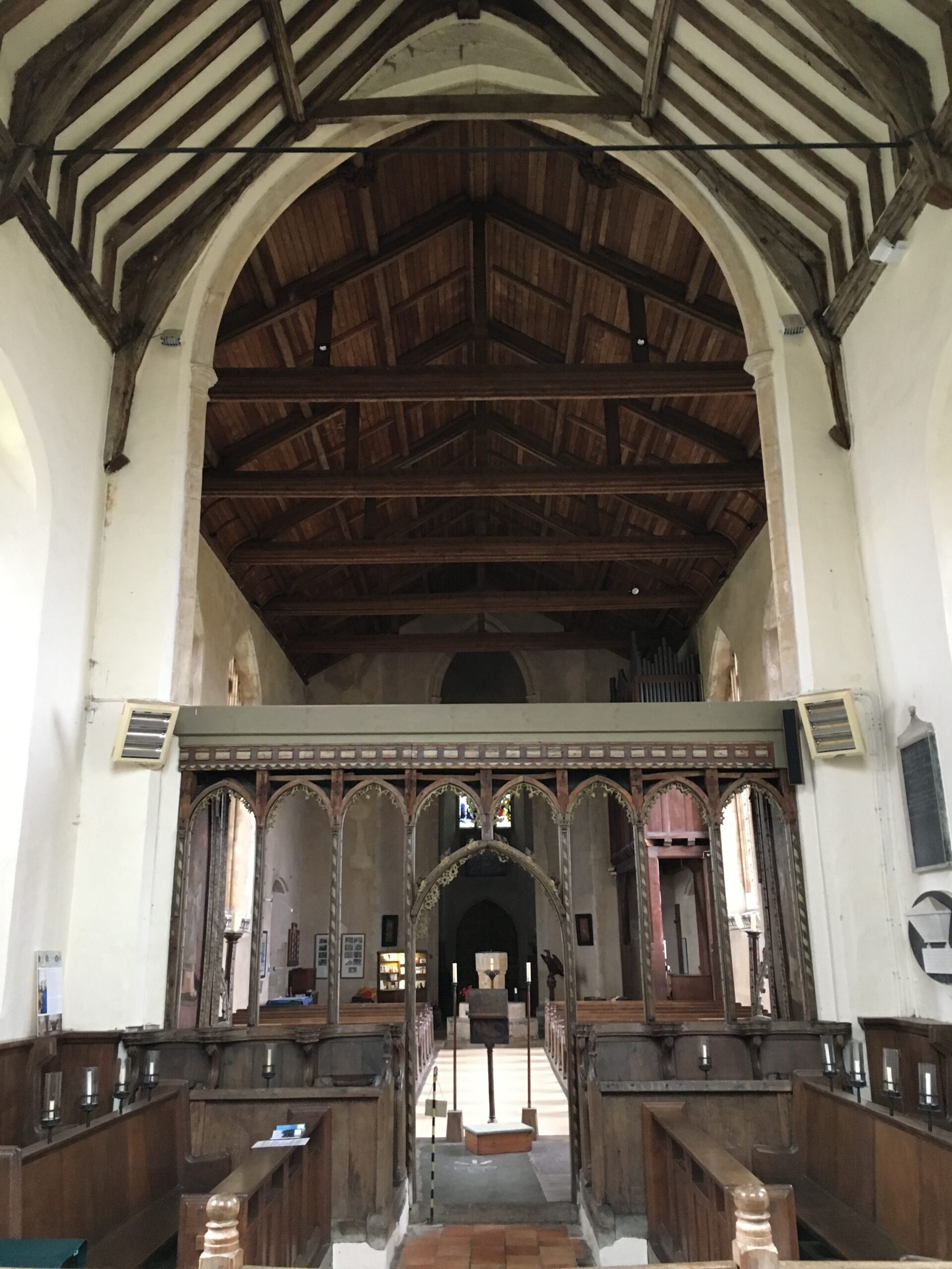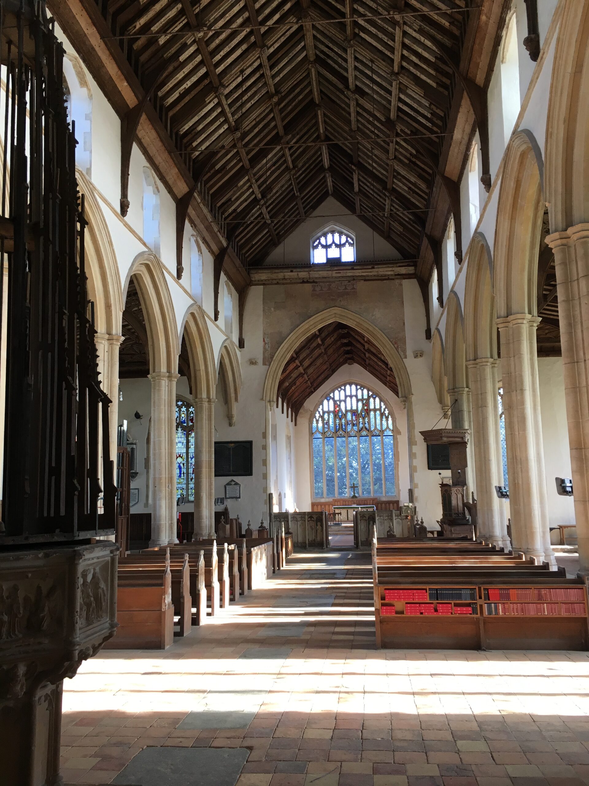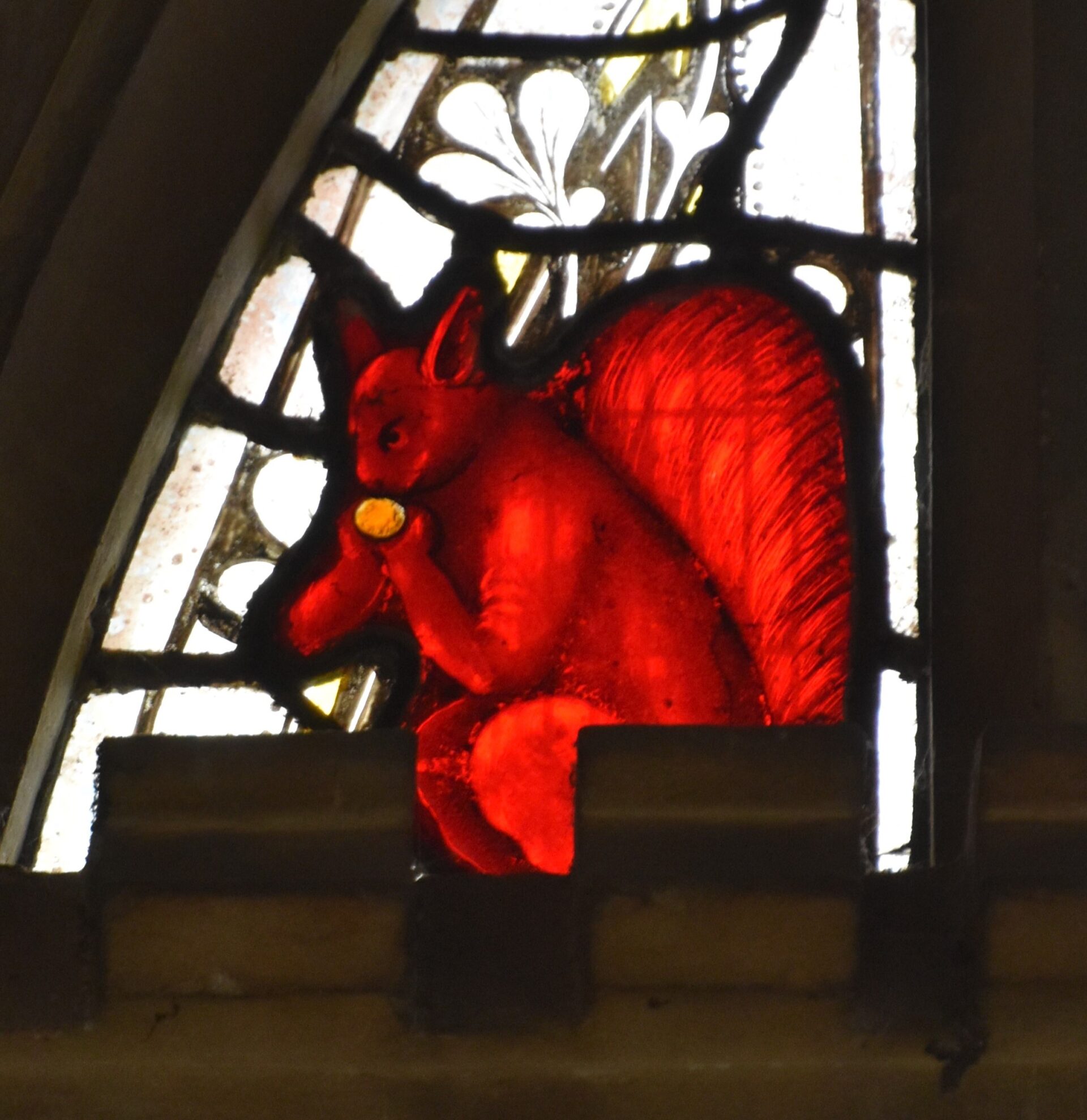 Commanding a prominent position next to the River Thet, St Peter & St Paul’s Church is truly one of the finest in Norfolk. The church is brimming with interest. Lovers of architecture, craftsmanship, monuments and medieval glass will find much to delight and fascinate them. The lower stages of the tower date to the 14th century. Gaze up at the 15th century battlements and you will notice symbols of the Harling family and figures between the pinnacles. A small spire rises from flying buttresses which, it is said, provided the inspiration for the spire of St Peter Mancroft in Norwich. The church was largely rebuilt in the early 15th century. Eighteen clerestory windows pierce the space above their larger nave counterparts. In 1840 the porch was rebuilt. Step through the 14th century doorway into a bright, lofty space encased by a grand hammer-beam roof. More symbols of the Harling family adorn the the south aisle spandrels in the form of bulls, unicorns and frails (a rush basket used by workmen). The south aisle chapel is enclosed by a 15th century screen to the west and an earlier parclose screen to the north. Marvel at the tomb of Sir Robert Harling and his wife. The brass states ‘His fame flourished well known amongst many of its natives of France – at length mangled by force of arms he died at Paris in 1435.’ The other tomb is that of Sir Thomas Lovell (d. 1604) and his wife. Try to work out what is being held up at the feet of Mrs Lovell – a Saracen’s scalp. Anne Harling and her first husband lie under the lavish 15th century tomb in the north wall of the chancel. The effigies have been lost but the elaborate stonework has survived. Anne and her first two husbands were responsible for the rebuilding of the church, including the reglazing. The east window is a vast kaleidoscope of medieval glass. It was brought back to the church in 1736 having been hidden away in the manor house before the Civil War and was once again removed temporarily during the Second World War. Biblical scenes abound. Anne’s first two husbands are depicted in the lower corners. Spot the red squirrel in the top left corner, a symbol of the Lovell family which also appears on the memorials in the chancel. It features in Hans Holbein’s painting A Lady with a Squirrel and a Starling, thought to be of Anne Lovell. The starling represents the manor of East Harling. Bring your binoculars!