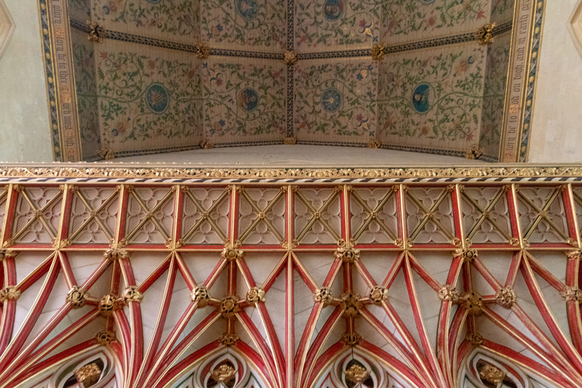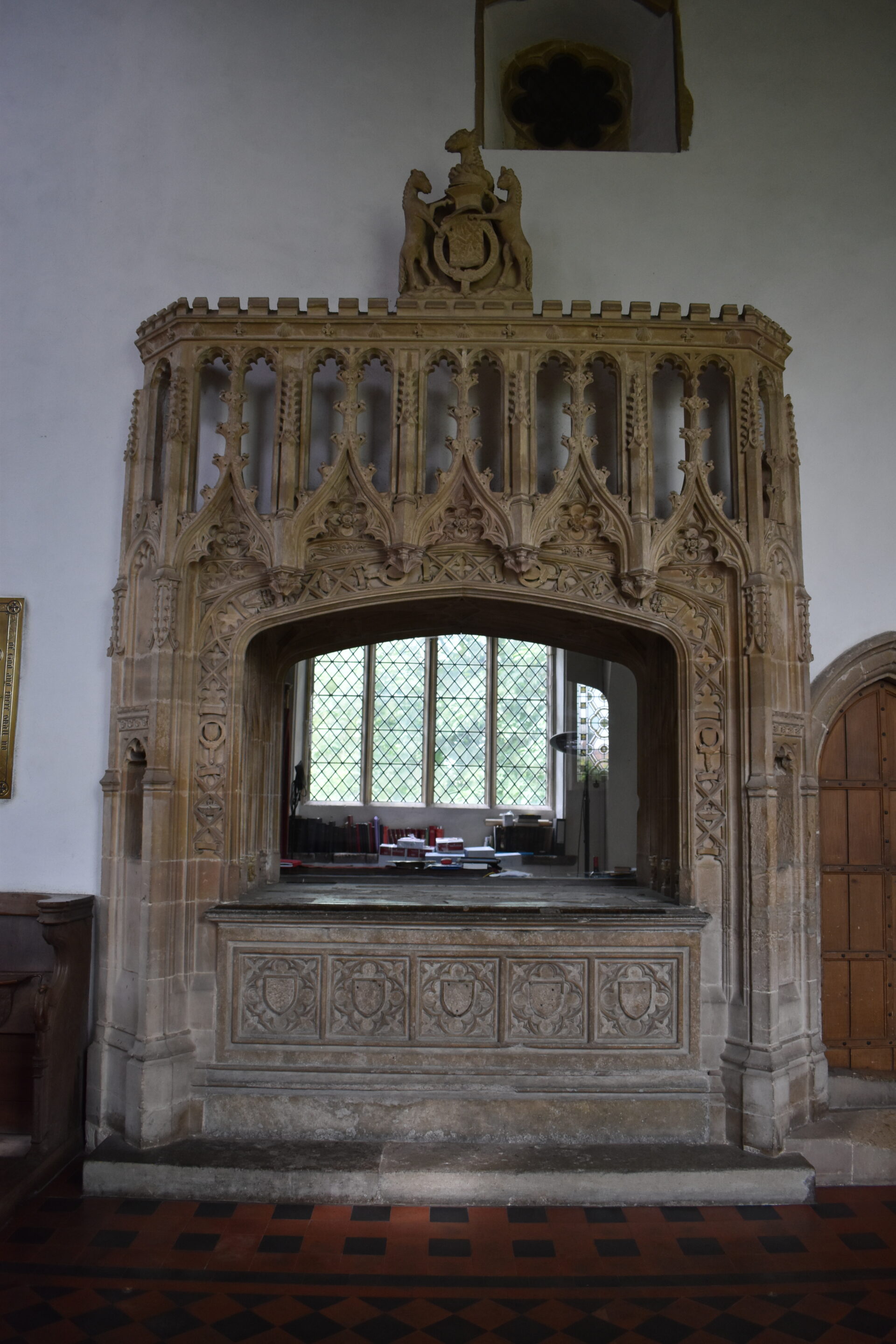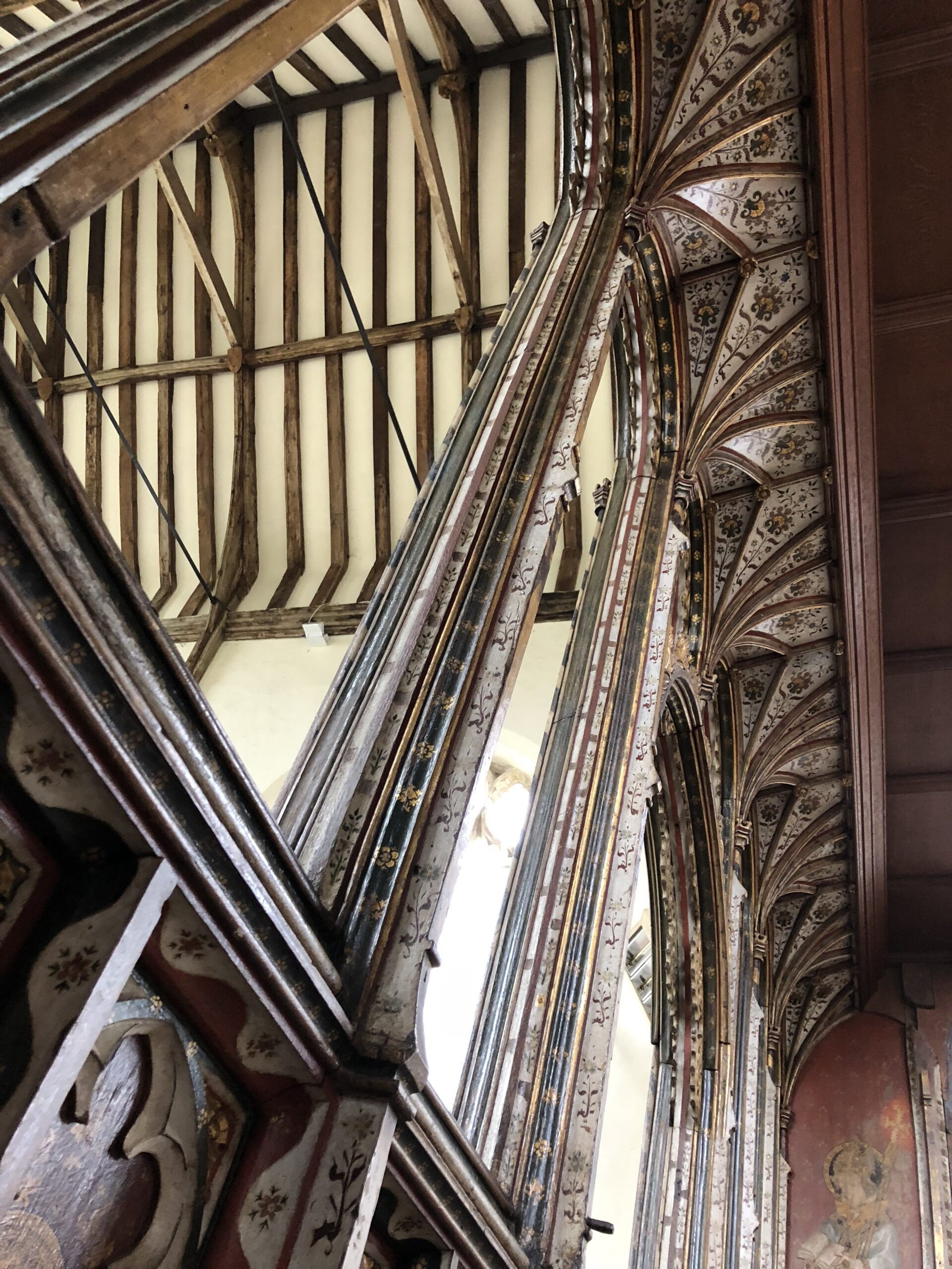 Commanding a prominent position next to the River Thet, St Peter & St Paul’s Church is truly one of the finest in Norfolk. The church is brimming with interest. Lovers of architecture, craftsmanship, monuments and medieval glass will find much to delight and fascinate them. The lower stages of the tower date to the 14th century. Gaze up at the 15th century battlements and you will notice symbols of the Harling family and figures between the pinnacles. A small spire rises from flying buttresses which, it is said, provided the inspiration for the spire of St Peter Mancroft in Norwich. The church was largely rebuilt in the early 15th century. Eighteen clerestory windows pierce the space above their larger nave counterparts. In 1840 the porch was rebuilt. Step through the 14th century doorway into a bright, lofty space encased by a grand hammer-beam roof. More symbols of the Harling family adorn the the south aisle spandrels in the form of bulls, unicorns and frails (a rush basket used by workmen). The south aisle chapel is enclosed by a 15th century screen to the west and an earlier parclose screen to the north. Marvel at the tomb of Sir Robert Harling and his wife. The brass states ‘His fame flourished well known amongst many of its natives of France – at length mangled by force of arms he died at Paris in 1435.’ The other tomb is that of Sir Thomas Lovell (d. 1604) and his wife. Try to work out what is being held up at the feet of Mrs Lovell – a Saracen’s scalp. Anne Harling and her first husband lie under the lavish 15th century tomb in the north wall of the chancel. The effigies have been lost but the elaborate stonework has survived. Anne and her first two husbands were responsible for the rebuilding of the church, including the reglazing. The east window is a vast kaleidoscope of medieval glass. It was brought back to the church in 1736 having been hidden away in the manor house before the Civil War and was once again removed temporarily during the Second World War. Biblical scenes abound. Anne’s first two husbands are depicted in the lower corners. Spot the red squirrel in the top left corner, a symbol of the Lovell family which also appears on the memorials in the chancel. It features in Hans Holbein’s painting A Lady with a Squirrel and a Starling, thought to be of Anne Lovell. The starling represents the manor of East Harling. Bring your binoculars!
