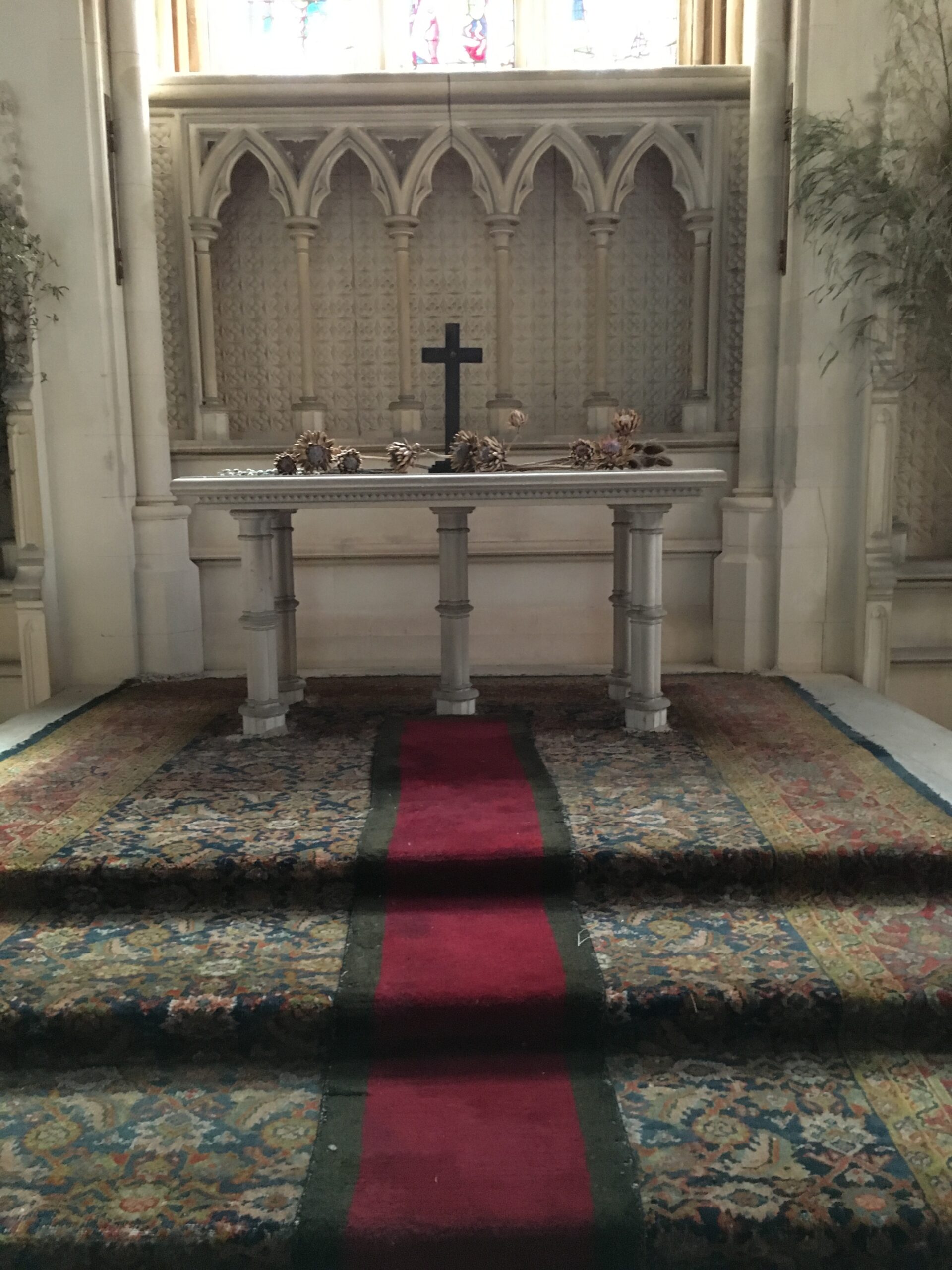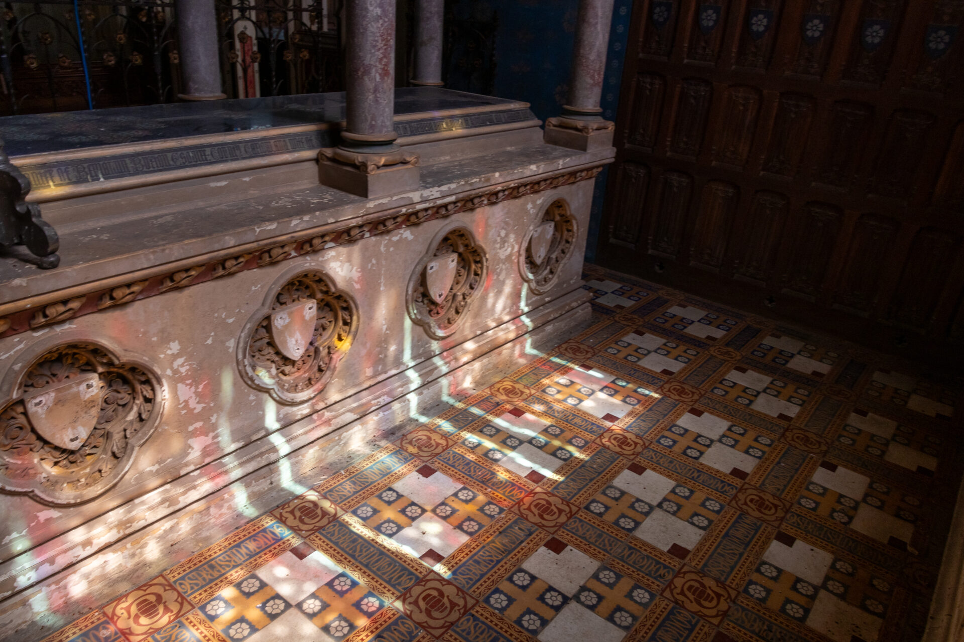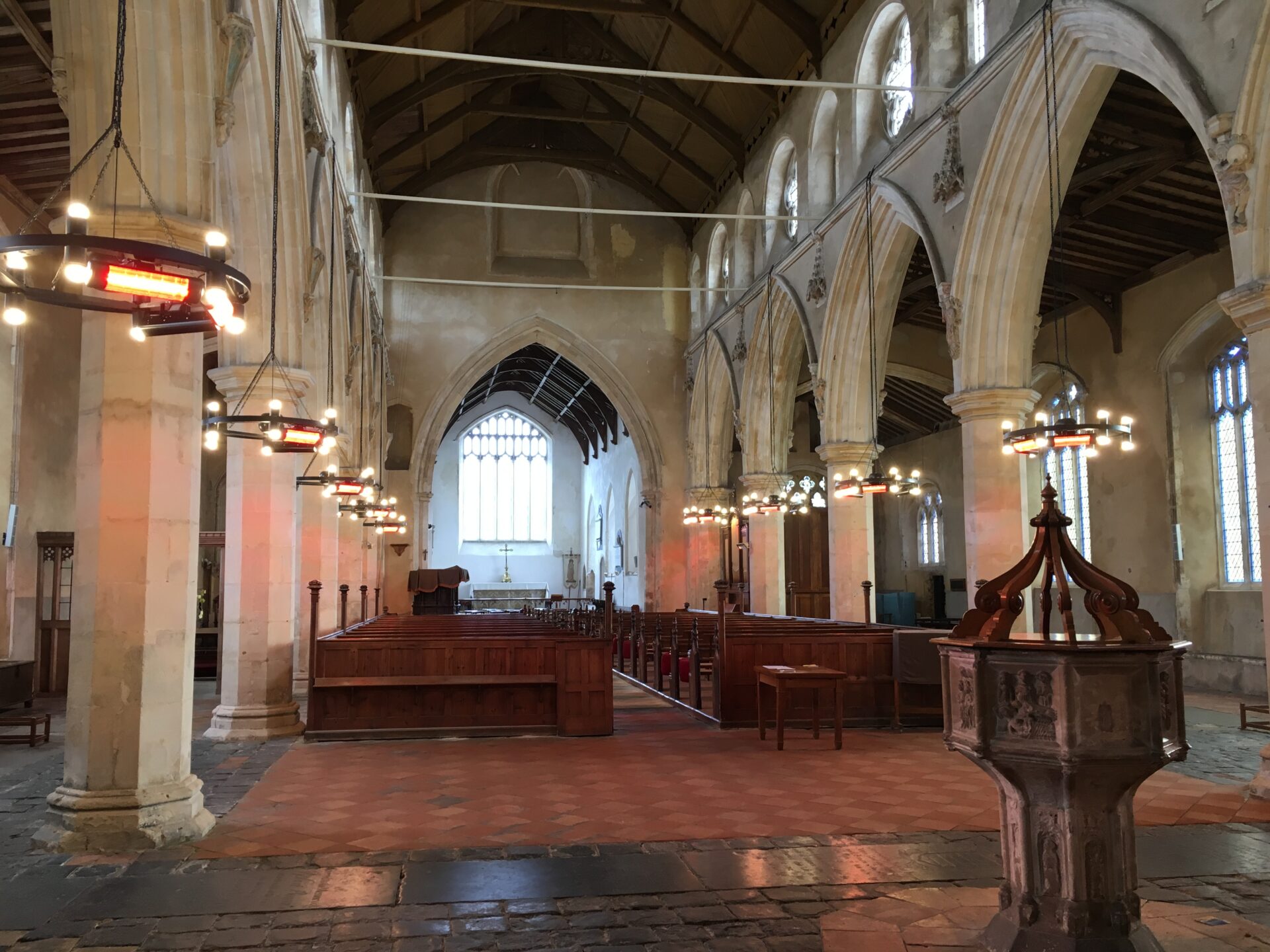 St Mary’s Church is located on the MoD’s STANTA base and access is highly restricted. The villages of West Tofts, Stanford, Langford and Tuttington became deserted when the area was requisitioned in 1942. The church is of great interest and is one of the most noteworthy of its kind in the country – a medieval church having been partly rebuilt by the ‘Morning Star’ of the Gothic Revival, A.W.N. Pugin. It displays some of the finest 19th century architecture in East Anglia. The north arcade and piers date to the early 14th century. The tower is later, in the Perpendicular style. Around the base-course, inscribed in stone, is a very rare catalogue of the names of the people who funded its construction, ‘the begyners of the werk’. Revd Augustus Sutton became the incumbent in 1849. He was the son of Sir Richard Sutton, one of the wealthiest landowners in England at the time. Pugin drew up plans for an extensive restoration which included the rebuilding of the north aisle as a Sutton family burial chapel, the creation of a larger chancel, a south porch, and the addition of pinnacles, a spire (removed in 1930), stained glass and new bells. No expense was spared. The highly skilled workmen had experience on Pugin’s projects at Catholic cathedrals and the Houses of Parliament. Even with the absence of most of the furnishings, which found homes in other Norfolk churches, the opulence of the interior is breathtaking. The beautiful parclose screen, in the East Anglian style of the 15th century, displays the Sutton motto ‘Tout Jours Prest’ (always be ready). The most remarkable feature of the church is the Sutton Chapel, an extravaganza of design and colour from the the painted ceiling to the floor tiles. The tomb is that of Mary, wife of Sir Richard Sutton, and their infant son. The tomb has a canopy with crocketted gables, supported by trefoil arches on marble pillars. The magnificent reredos is made of Caen stone and depicts Christ with the Evangelists.