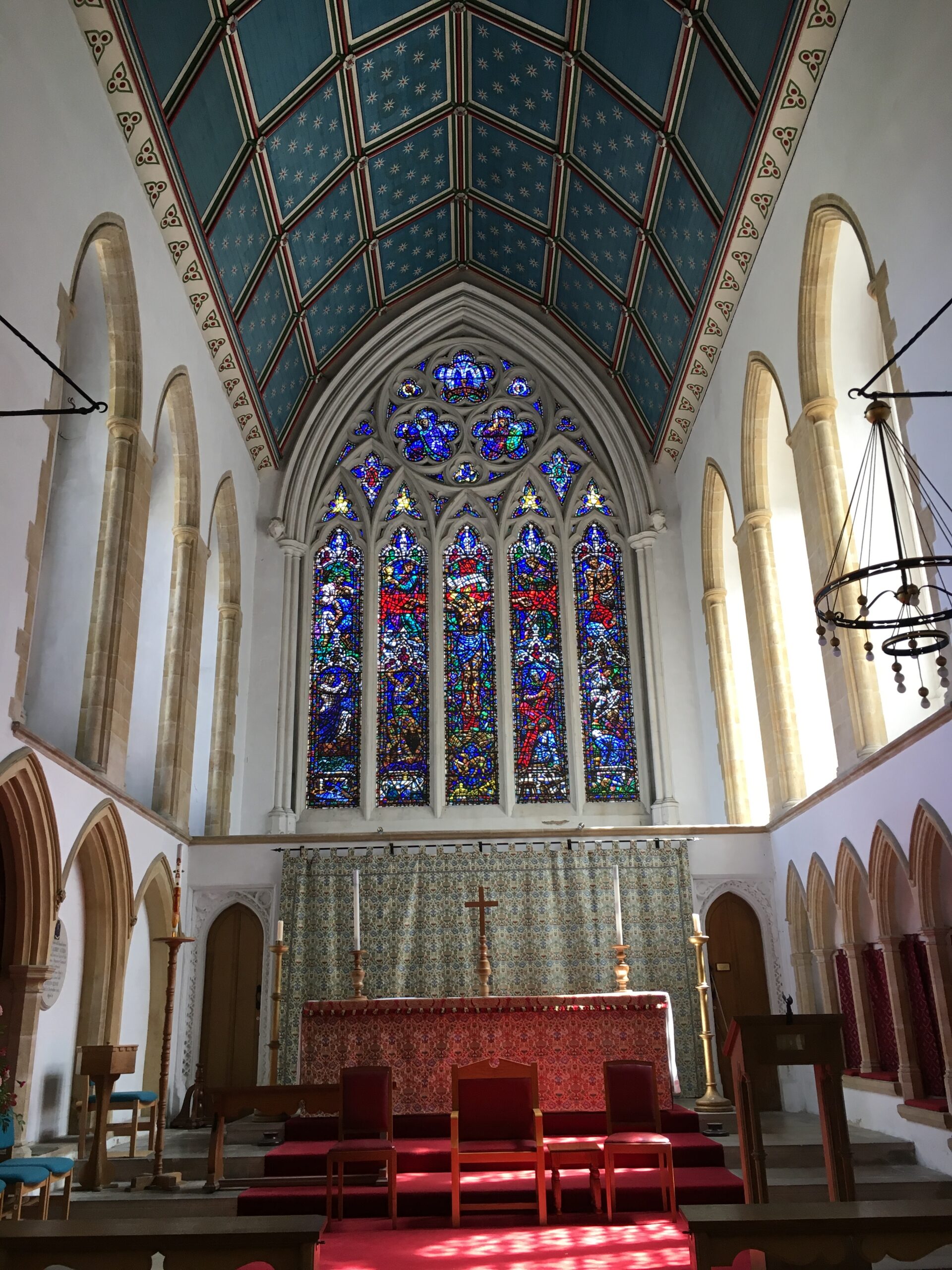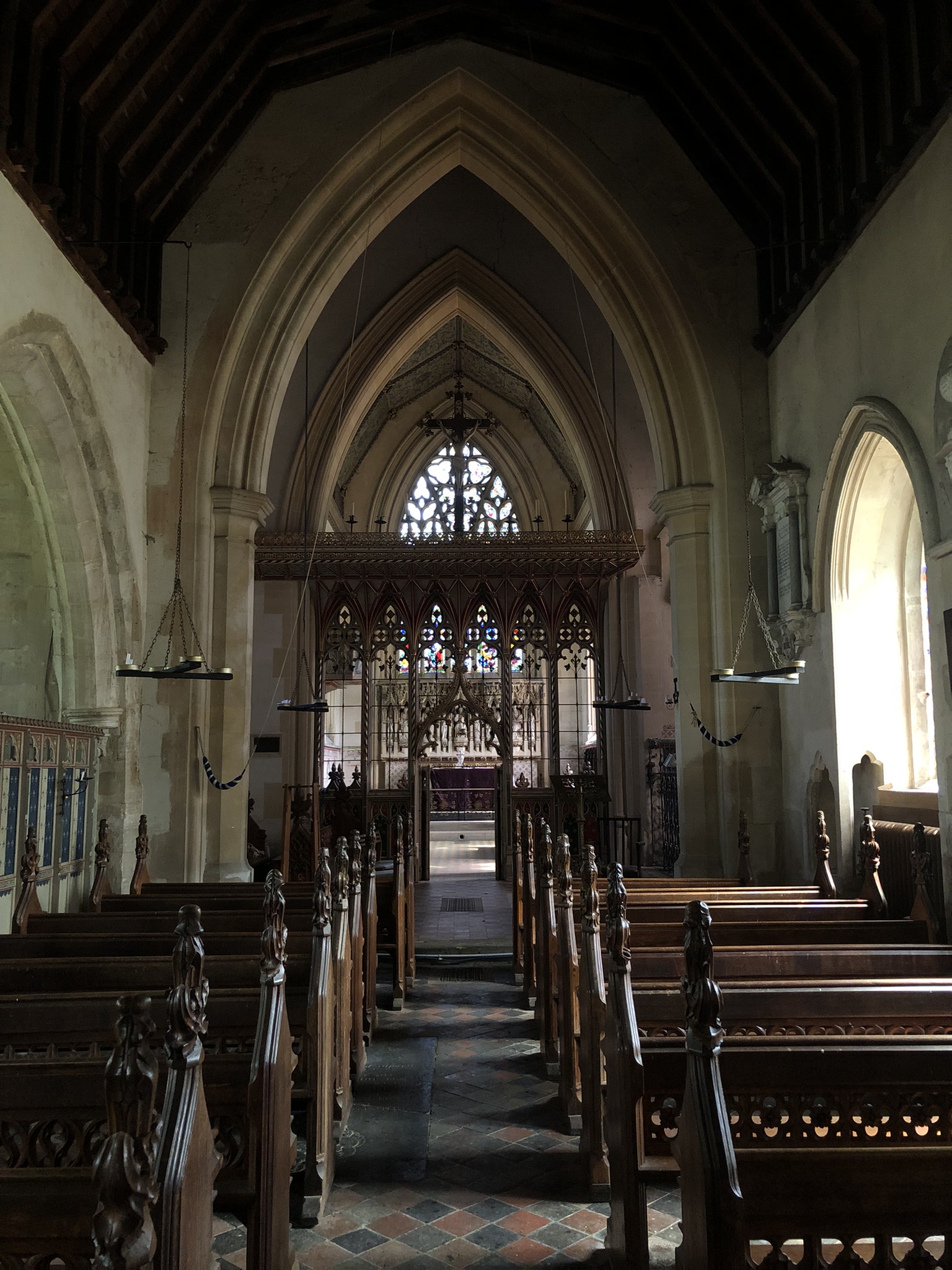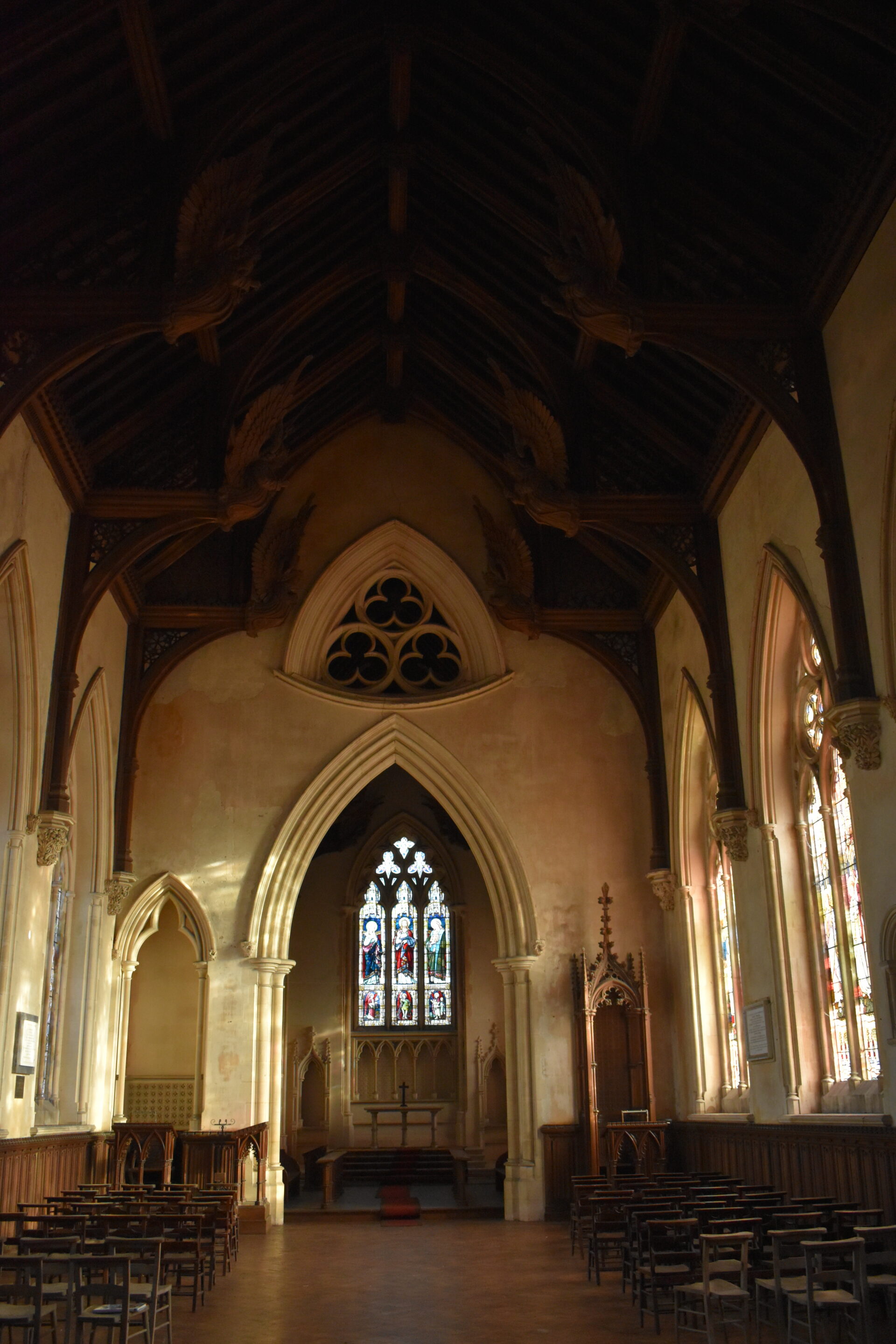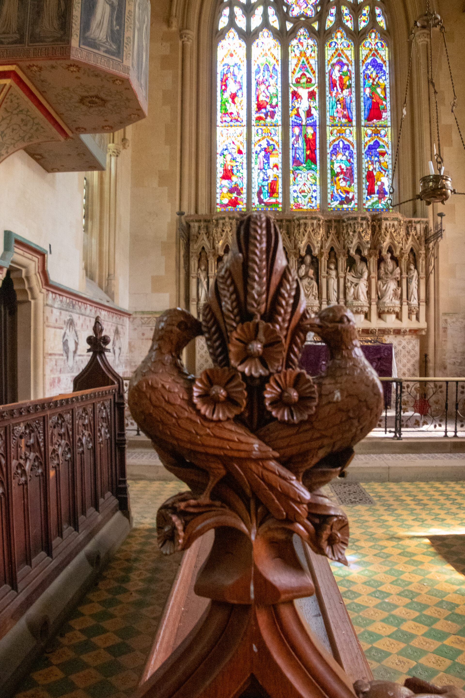Reverend Whitwell Elwin was the rector of Booton, St Michael & All Angels for fifty years from 1850 to 1900 and we have him to thank for this superb church. He had the vision to encase the chancel and completely rebuild the rest of the church in his own exuberant interpretation of the Early English style. Inspiration was taken from a multitude of different sources to produce the characterful design we see today including Peterborough and Milan Cathedrals, St Stephen’s Chapel in Westminster, Glastonbury Abbey and Temple Balsall, St Mary in the West Midlands. Architect Edwin Lutyens described his creation as ‘very naughty, but in the right spirit.’ The church was completed in 1891. The exterior is striking with its highly decorative west towers placed on the diagonal and central minaret. The church is festooned in pinnacles and crocketting, and the geometric tracery of the windows adds a modern feel. Notice the commanding figure of St Michael atop a dragon looking out from a statue niche above the west porch. The interior does not disappoint. There is a majestic hammerbeam roof complete with huge angels. Angels also feature heavily in the stained glass windows, which form a complete scheme of glazing rarely found in the county.