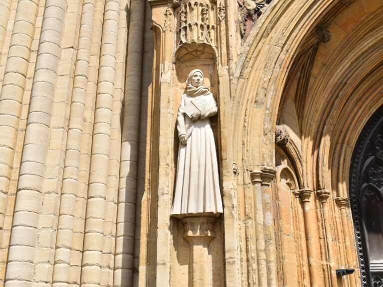 One of Julian’s more well-known experiences was hearing God say, ‘All shall be well, all shall be well and all manner of thing shall be well.’ Julian tries to reconcile the teachings of the Church regarding sin and punishment with her understanding of God as love. Why did God create sin? God shows her a list of famous sinners, including David, St Paul and John of Beverley, who, after repentance, gained greater reward because they had sinned. At the end of time God will do a great deed to make all things well. Her ultimate revelation was that God is love and only love. Julian became a figure of authority in Norwich. In the 17th century, her long text was printed under the title ‘Revelations of Divine Love’. A modern English translation was produced in the early 20th century. In the 1980s, interest in Julian greatly increased and wide scholarship resulted. She has inspired poetry, plays, novels and artistic productions.