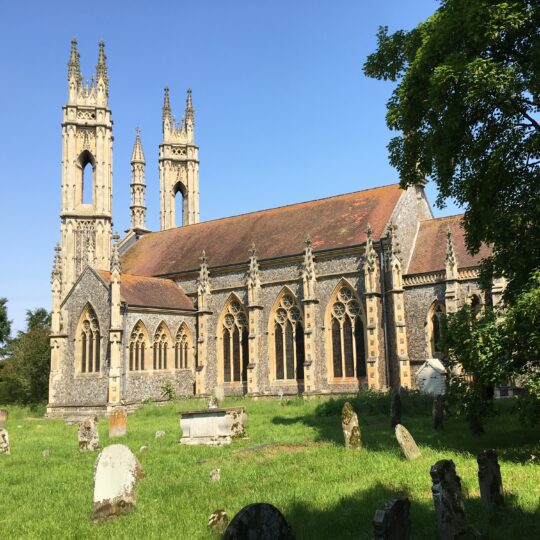 St Michael and All Angels Church in Booton was inspired by the Victorian work of Reverend Whitwell Elwin, who created a splendid ‘gothick’ pastiche drawing on examples of church architecture from across the land. It has three towers, one a minaret standing between the two taller ones. The church interior also features some excellent carpentry and coloured glass, featuring many angels, a precursor to the glories you will see at our next church. Don’t miss the priest’s door on the north side of the chancel.